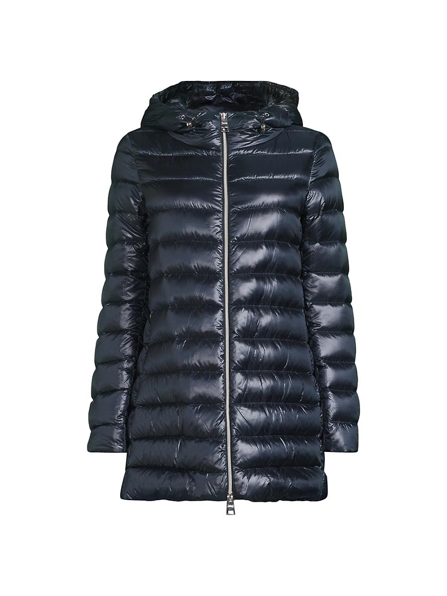 Crafted of water-resistant shiny nylon, this Herno coat highlights an A-line silhouette detailed with a drawcord hood, side zip pockets, and a front zip closure. Down and feather filling lends added warmth to this style. Hood Long sleeves Side seam zip pockets Front zip closure 100% nylon Lining: 100% nylon Fill: 90% down/ 10% feather Hand wash Imported SIZE & FIT Model measurements: 510 tall Model is wearing a US size 4. Outerwear And Swimwear - Down > Herno > Saks Fifth Avenue > Barneys. Herno. Color: Navy. Size: 12.