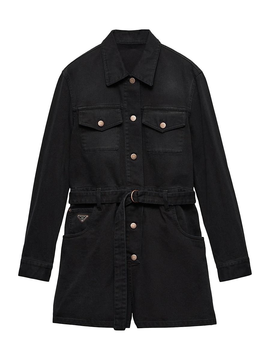 The denim jumpsuit, the perfect utility garment, is reinterpreted in a short design with contemporary style characterized by a relaxed fit. The garment completed by a belt that emphasizes the waist is decorated with the distinctive triangle logo. Washed treatment Garment-dyed Loose fit Unlined garment Shirt-style collar Front button closure Long sleeves Matching stitching Triangle logo Center-back length: 56.5 cm, Size: 38 Flapped button pockets on the chest Rounded front pockets with coin pocket Belt with buckle Prada Milano logo label on the back 100% Cotton Made in Italy. Lsd Rtw - Prada Rtw > Prada > Saks Fifth Avenue > Barneys. Prada. Color: Black. Size: 12.