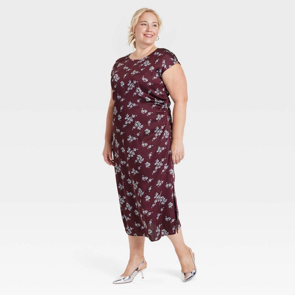 Whether youre getting ready for an office meeting or sipping cocktails on the weekend, this Short-Sleeve Ruched Midi Shift Dress from A New Day is the ultimate pick for any occasion. Fashioned in a midi length, this short-sleeve shift dress features a casual crew neckline, a side slit detail and ruched detailing on both sides for on-trend flair. The midweight recycled polyester fabric keeps you in absolute comfort, while the side zipper and keyhole back button closure allows for ease of wear. A New Day: Style that goes wherever you do.