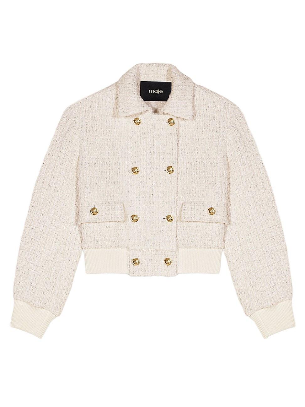 The studio has come up with a wardrobe with fresh accents, where timeless pieces are reinvented with an interplay of materials and sophisticated details. Made from a tweed-effect fabric, this short, structured jacket features a double-breasted style with gold buttons and two buttoned flap pockets. It has ribbed hems and is fully lined for extra comfort. The sleeve hems and elasticated mesh waistband give this jacket a sporty edge. Go for a casual look with jeans, a belt, trainers and a bag. Tweed-effect cropped jacket Double-breasted gold fastening 2 pockets with buttoned flaps Ribbed trim Lined Main fabric: 50% recycled cotton, 30% polyester, 12% acrylic, 5% viscose, 2% polyamide, 1% metalized fibers Lining: 100% viscose Rib: 60% cotton, 25% polyester, 15% polyamide Imported SIZE & FIT Model measurements: 511 Model is wearing a size 4. Lsd Rtw - Maje > Maje > Saks Fifth Avenue > Barneys. Maje. Color: Ecru. Size: 10.