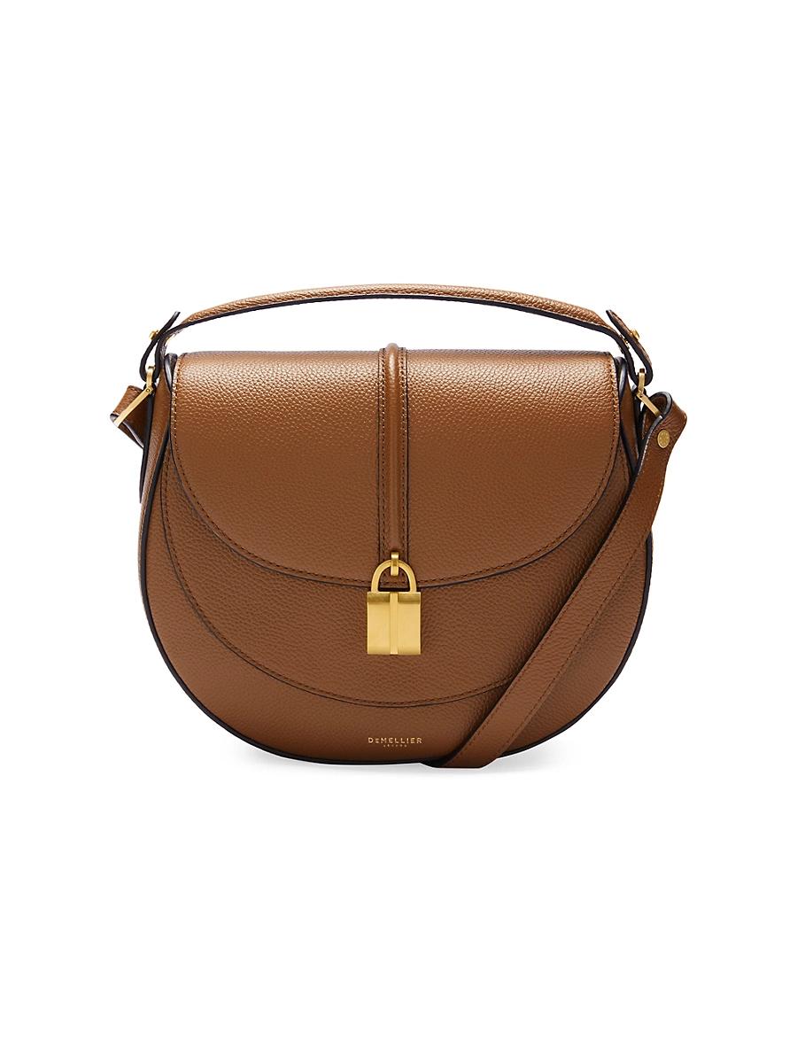 A versatile, elegant style, this Sienna saddle bag from DeMellier can be worn crossbody or in hand by the top handle. Featuring a padlock-inspired evolution of double-bar hardware, this round-structured bag also carries beautiful leather detailing through the center and a brushed gold-plated double D-ring and buckle. Top handle Adjustable shoulder strap Exterior: one slip pocket Flap with magnetic closure Leather Lining: cotton Imported SIZE About 8-8.6W x 8H x 2.4D Top handle drop: about 4 Adjustable shoulder strap: about 18-24. Handbags - Collection Handbags > Demellier > Saks Fifth Avenue > Barneys. DeMellier. Color: Tan.