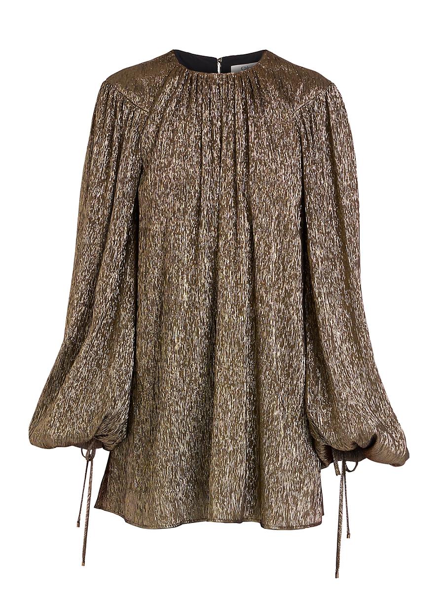 This draped minidress from Chlo is crafted of silk-blend metallic lam. Round neck Long sleeves Side slip pockets Back button closure 71% silk/29% polyester Lining: 68% acetate/32% silk Dry clean Imported SIZE & FIT Model measurements: 510 tall Model is wearing a US size 4 ABOUT THE BRAND In 1952, founder Gaby Aghion established Chlo as an alternative to couture, and to appeal to the aspirations and empowerment of women. The label is now led by Creative Director Chemena Kamali, who furthers its signature aesthetic of cool, French-girl style. Advanced Designer - Chloe Rtw > Chlo > Saks Fifth Avenue > Barneys. Chlo. Color: Black Gold. Size: 6.
