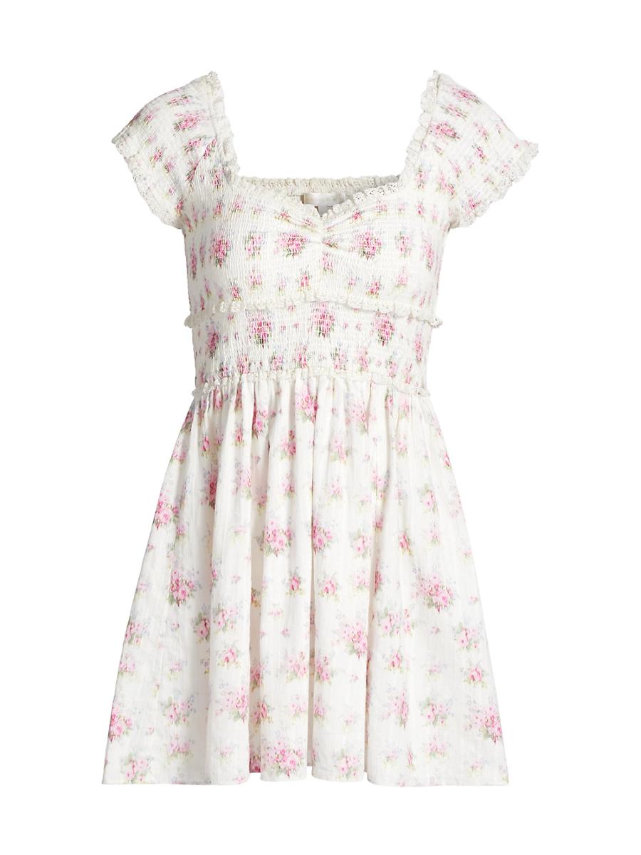 LoveShackFancys Siona fit-and-flare minidress is crafted of floral-print cotton and styled with a smocked sweetheart bodice. Sweetheart neck Short sleeves Smocked bodice Pulls over 100% cotton Lining: 100% cotton Hand wash Imported SIZE & FIT About 30.5 from shoulder to hem Model Measurements: 510 tall Model is wearing a US size Small. Contemporary Sportswear - Trend > Loveshackfancy > Saks Fifth Avenue > Barneys. LoveShackFancy. Color: Thulian Pink. Size: XS.