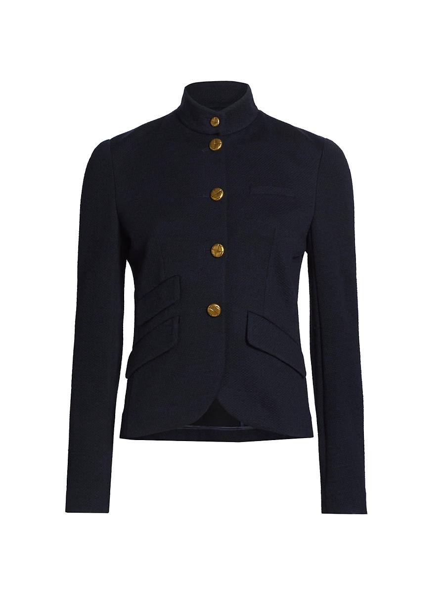 This fitted cropped Slade blazer from rag & bone is designed with a textured finish, a stand collar, and metallic buttons. Stand collar Long sleeves, button cuffs Chest welt pocket Side flap pockets Button-front closure 28% virgin wool/27% acetate/24% viscose/18% polyamide/3% elastane Dry clean Imported SIZE & FIT About 21 from shoulder to hem Model measurements: 510 tall Model is wearing a US size 4 ABOUT THE BRAND In 2002, rag & bone founder Marcus Wainwright combined his British heritage with a downtown-New York aesthetic to set the tone for the label. At the heart of the edgy-yet-laid-back brand is its focus on quality craftsmanship and attention to detail. The epitome of cool, off-duty style, its no wonder the signature second-skin denim is favored by many. Contemporary Sportswear - Rag And Bone > Rag & Bone > Saks Fifth Avenue > Barneys. rag & bone. Color: Navy. Size: 0.