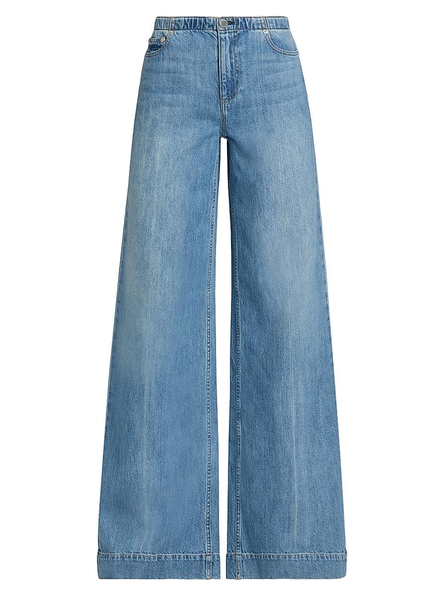 Crafted of cotton, these Slay low-rise jeans from Alice + Olivia feature an elasticized waistband, five-pocket styling, and a wide-leg silhouette. Elasticized waistband Five-pocket style Zip fly, button closure 100% cotton Lining: 100% polyester Dry clean Imported SIZE & FIT Rise: about 9.5 Inseam: about 34.5 Leg opening: about 26 Model measurements: 510 tall Model is wearing a US size 4 ABOUT THE BRAND Founder Stacey Bendet has been embracing bold color, eclectic prints and an overall pass