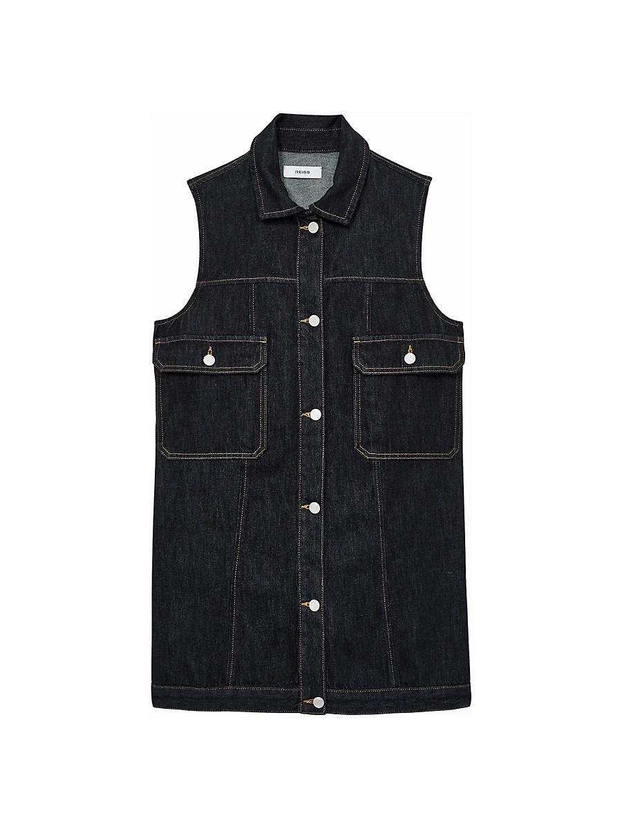 Crafted of denim, Reiss Ateliers minidress features a spread collar, sleeveless cut, and button-front closure. Spread collar Sleeveless Button-front closure 67% cotton/22% viscose/11% polyester Machine wash Imported SIZE & FIT Model measurements: 510 tall Model is wearing a Us size small. Modern Collections - Modern Trend > Reiss Atelier > Saks Fifth Avenue > Barneys. Reiss Atelier. Color: Indigo. Size: Medium.