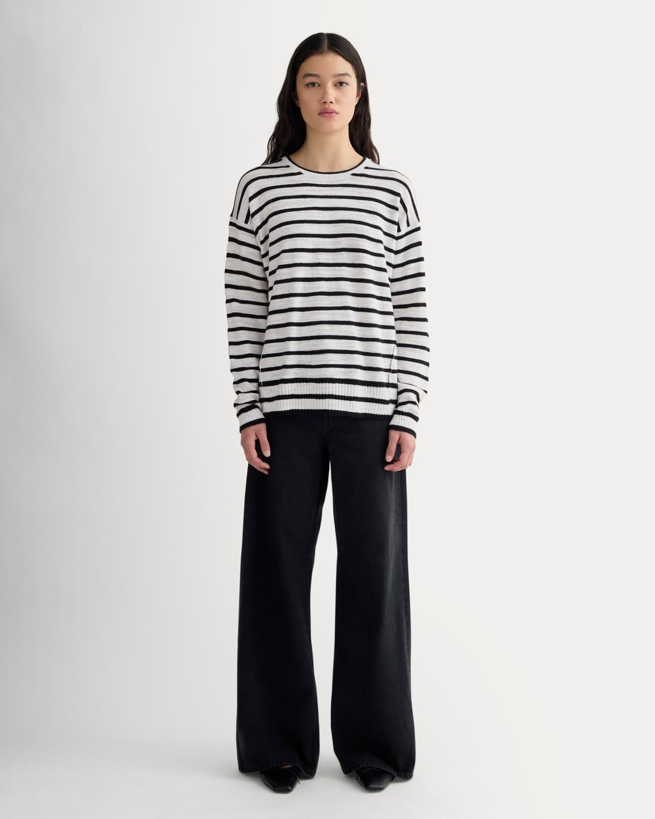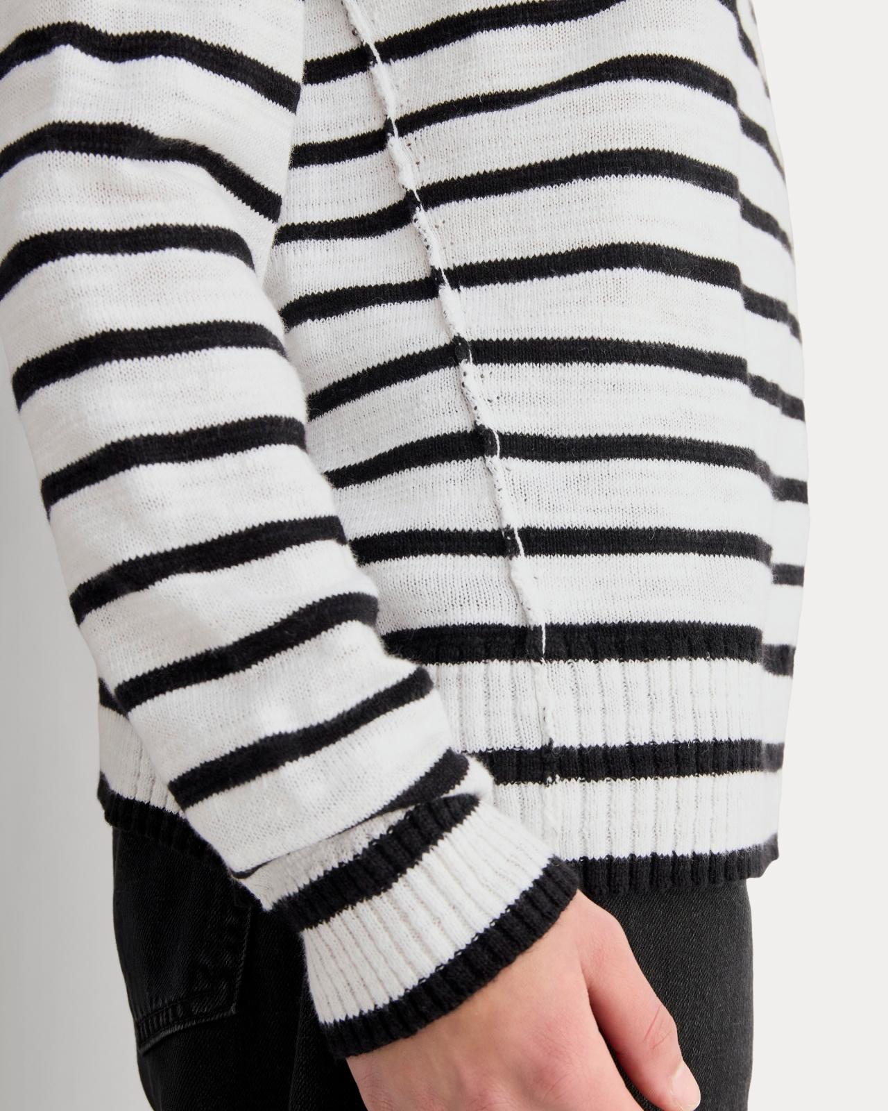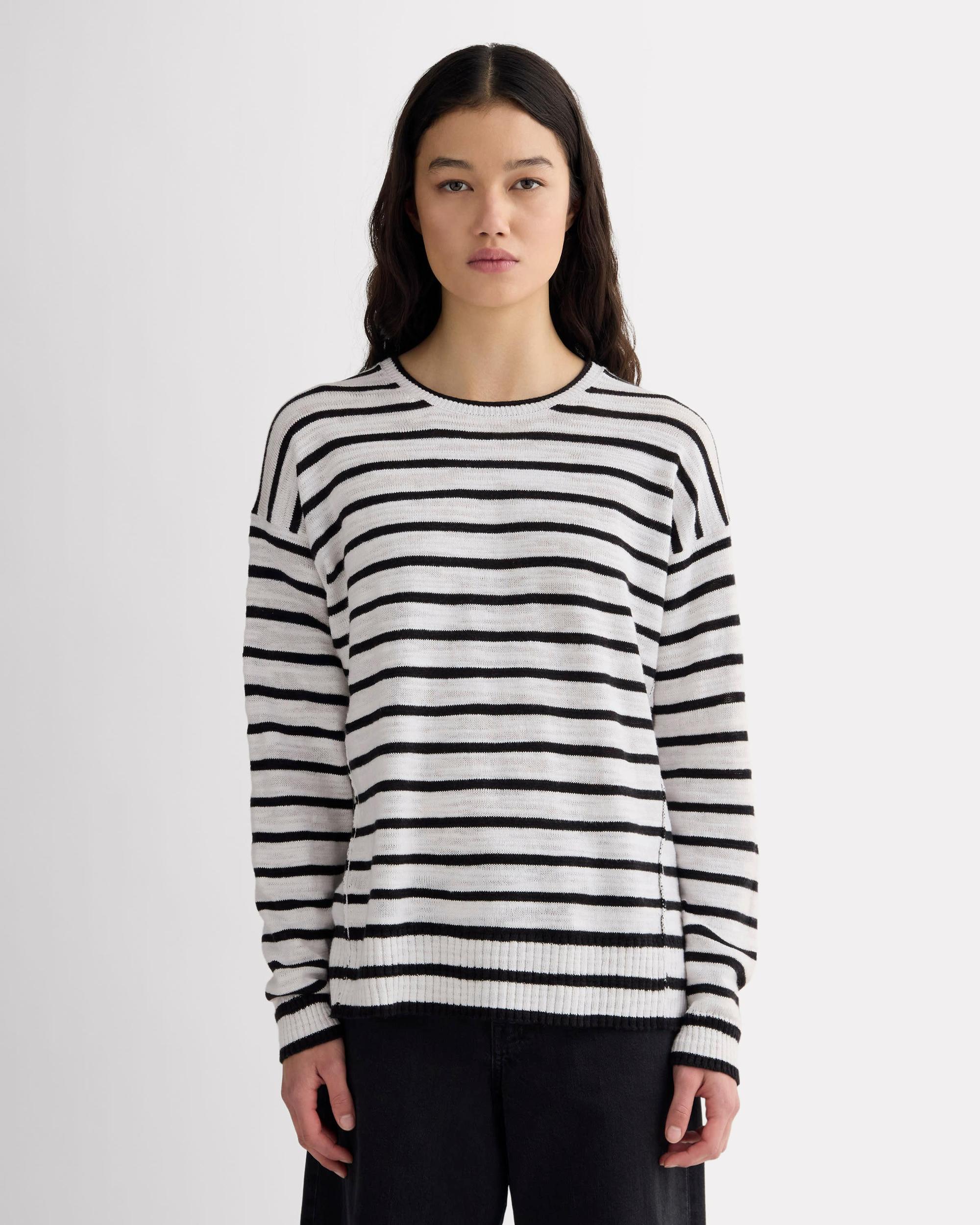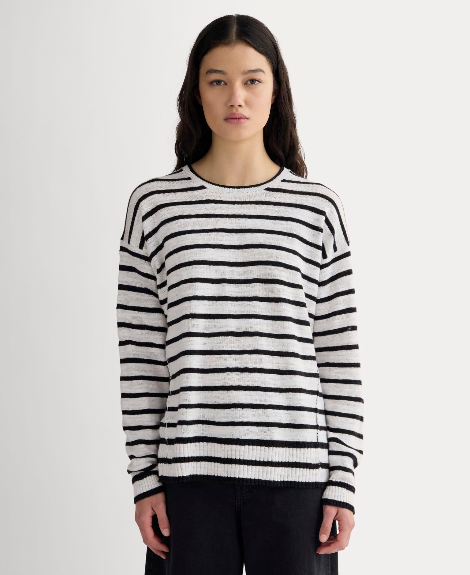 A cool layer for warmer weather. Made from a lightweight cotton-linen blend, this slouchy sweater features a crew neckline with jersey details, visible side seams, relaxed silhouette with dropped shoulders, cropped cut, and a slubby, heathered texture. We love it on its own, over tees, or on top of bikinis in the summer.