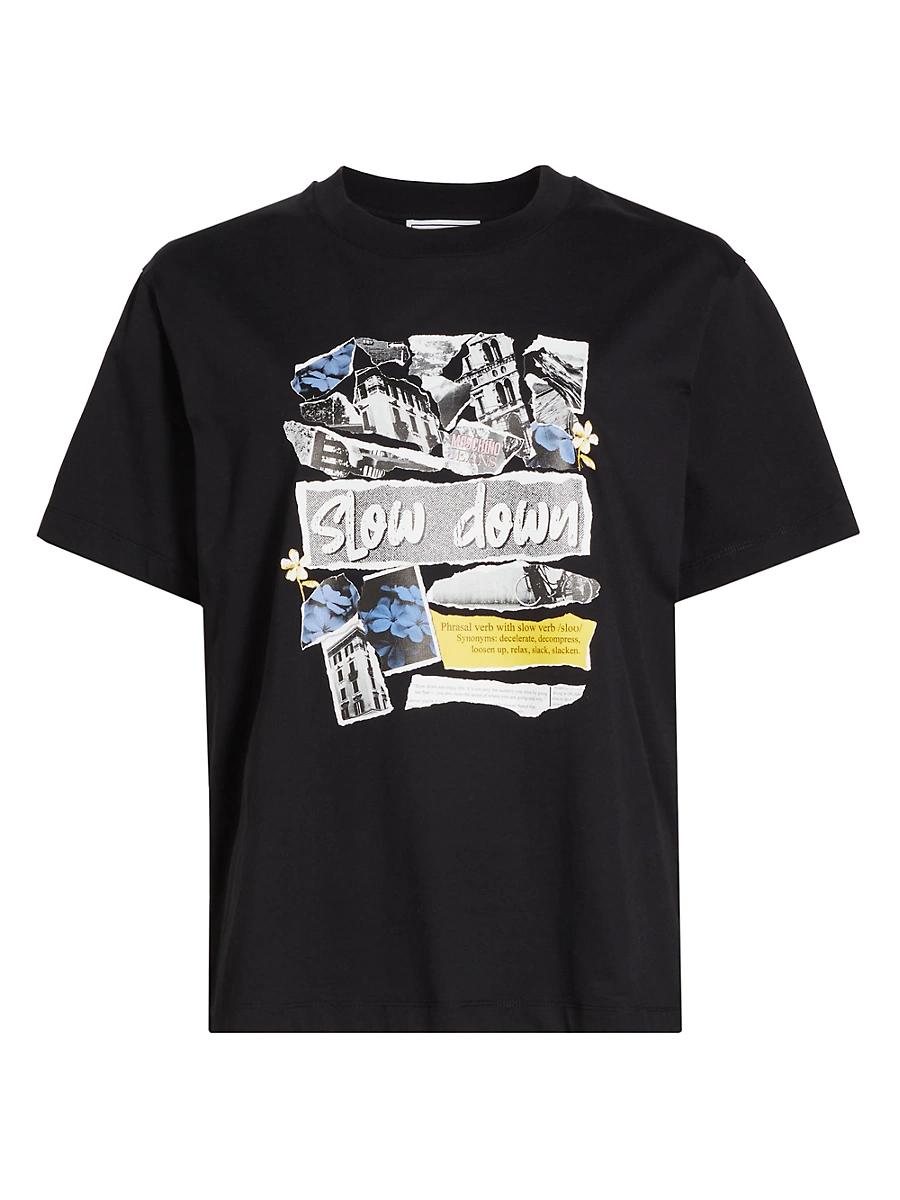Moschinos crewneck t-shirt is crafted of jersey cotton and adorned with a Slow Down graphic on the front. Crewneck Short sleeves Pulls over 100% cotton Machine wash Made in Portugal SIZE & FIT About 26 from shoulder to hem Model measurements: 510 tall Model is wearing a US size Small. Contemporary Sportswear - Denim And Bottoms > Moschino Jeans > Saks Fifth Avenue > Barneys. Moschino Jeans. Color: Multi Black. Size: XL.
