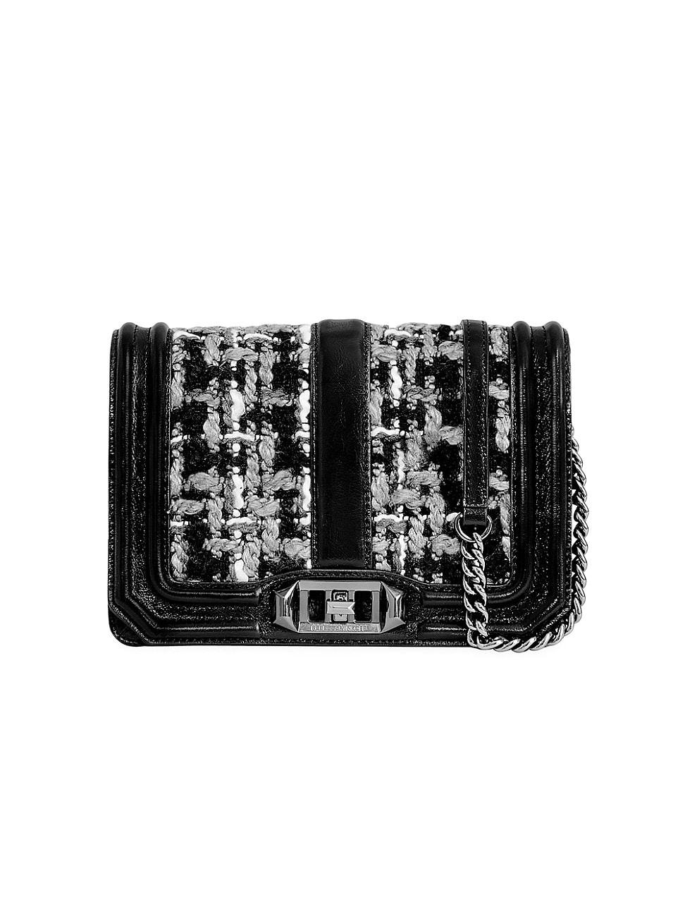 Rebecca Minkoffs small Love bag is rendered in tweed with leather trim and a chain crossbody strap. Chain crossbody strap Turn-lock hardware Leather/polyester Lining: 100% polyester Imported SIZE About 8W x 5.5H x 2.25D Weight: about 0.75 lbs. Handbags - Contemporary Handbags > Rebecca Minkoff > Saks Fifth Avenue > Barneys. Rebecca Minkoff. Color: Black.