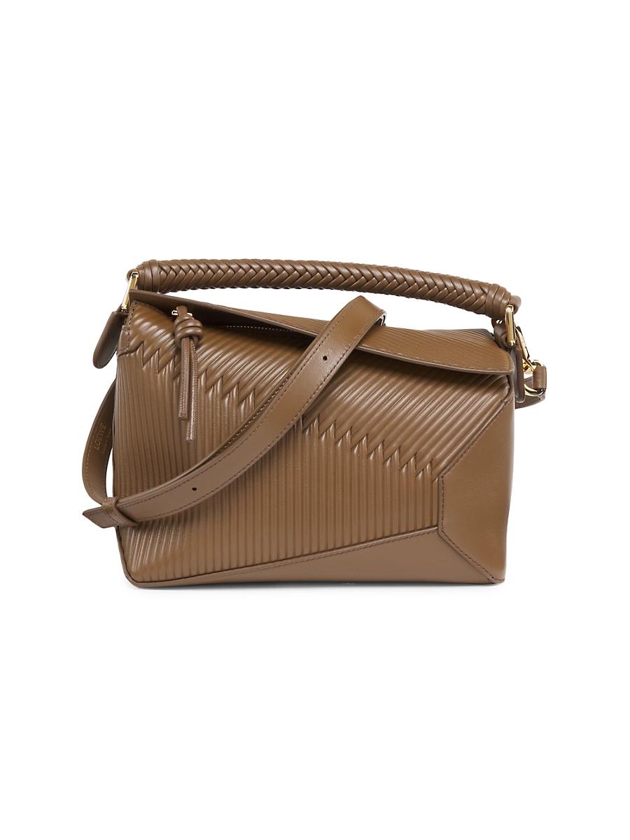 LOEWEs Small Puzzle Edge bag, a coveted piece from the Spanish fashion house, is crafted of premium leather, featuring a textured, woven effect. The designs innovative cubic construction offers a sophisticated and unique aesthetic. Top handle Adjustable, removable shoulder strap Flap with top zip closure Made in Spain SIZE About 9.4W x 6.4H x 4.1D. Handbags - Loewe Handbags > Loewe > Saks Fifth Avenue > Barneys. LOEWE. Color: Tundra.