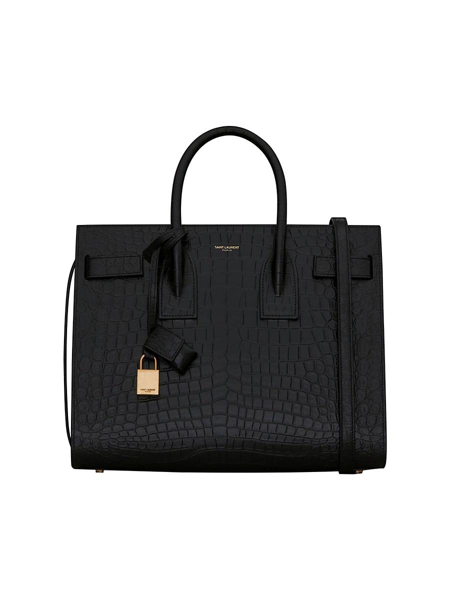 Sac de jour bag in its iconic size. Roomy and leather-lined, it features two compartments separated by a zipped pocket. Distinguishable by its accordion sides, snap tabs and brass padlock, it features a detachable shoulder strap. Leather lining Light bronze brass hardware Accordion sides Detachable padlock in leather case Interior zipped pocket Five metal feet Dimensions: 12.5 x 10 x 6.1 inches Strap length: 18.8 inches Strap drop: 3.7 inches Made in Italy. Lsd Handbags - Saint Laurent > Saint Laurent > Saks Fifth Avenue > Barneys. Saint Laurent. Color: Black.