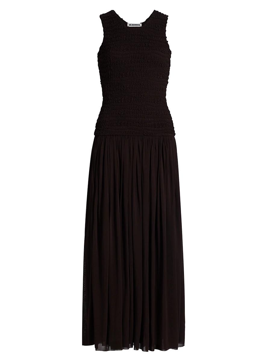 Crafted of a fluid knit, this Jil Sander maxi dress is designed with a smocked bodice and a gathered drop-waist skirt. Jewelneck Sleeveless Side zip closure 100% viscose Dry clean Imported SIZE & FIT This style is constructed in a stretch fabric for a tailored fit About 58 from shoulder to hem Bust: about 34 Waist: about 28 Model measurements: 510 tall Model is wearing a US size 4. Advanced European - Adv European > Jil Sander > Saks Fifth Avenue > Barneys. Jil Sander. Color: Chocolate Brown. Size: 2.