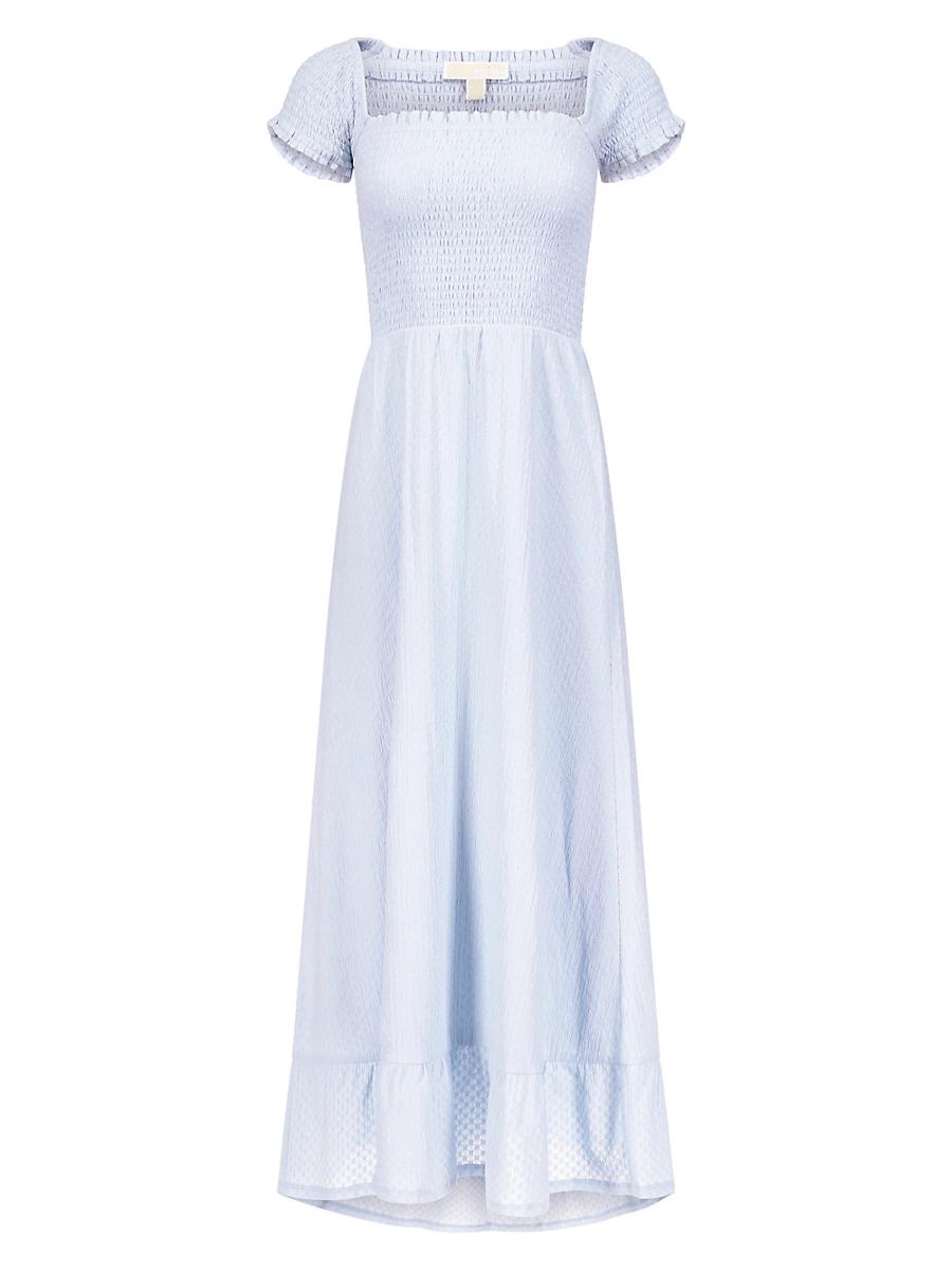 Finished in hammered knit, MICHAEL Michael Kors maxi dress showcases a fitted smocked bodice framed by cap sleeves and a flounced hem. Square neck Cap sleeves Smocked bodice Flounce hem Pulls over 98% polyester/2% elastane Lining: 100% polyester Machine wash Imported SIZE & FIT About 53 from shoulder to hem Model measurements: 510 tall Model is wearing a US size Small. Modern Collections - Michael Michael Kors > Michael Michael Kors > Saks Fifth Avenue > Barneys. MICHAEL Michael Kors. Color: Pastel Blue. Size: XL.