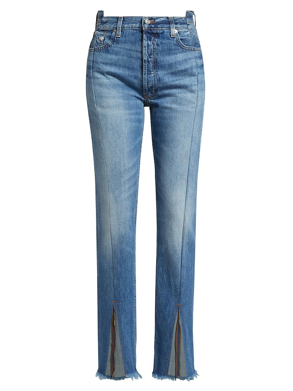 Cut in a straight-leg silhouette, EB DENIMs asymmetric high-waisted Hendrix jeans are finished with split ankle cuffs and a raw hem. Asymmetric waistband Belt loops Zip fly and button closure Waist slant pockets Mock contrast patch pockets Split ankle cuffs Raw hem 100% cotton Machine wash Made in USA SIZE & FIT Rise, about 12 Inseam, about 31 Model measurements: 510 tall Model is wearing a US size 4 Please: Due to the unique nature of the fabric, each item will vary slightly from what is pictured. Contemporary Sportswear - Denim And Bottoms > Eb Denim > Saks Fifth Avenue > Barneys. EB Denim. Color: Hendrix. Size: 27.