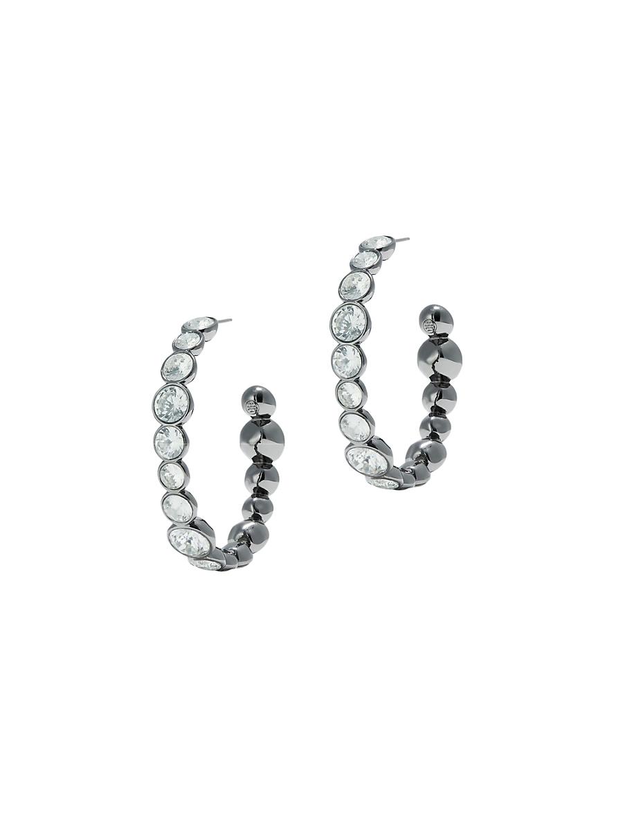 Tory Burchs hoop earrings feature mixed sizes of glittering cubic zirconia. Cubic zirconia Stainless steel Post back Imported SIZE About 0.79 diameter ABOUT THE BRAND Since debuting her brand in 2004, New York-based designer Tory Burch has made an impact on the fashion world with her handbags and shoes, and playful-yet-polished clothing. Today, Burch remains inspired by color and travel, with her vibrant collections bursting with prints, and her instantly recognizable double-T logo drawing from Moroccan architecture. Fashion Jewelry - Trend Jewelry > Tory Burch > Saks Fifth Avenue > Barneys. Tory Burch. Color: Shiny Hematite Crystal.