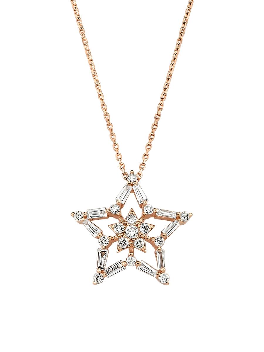 From the Star Light Collection. Embellished with baguette and brilliant-cut diamonds, Bee Goddess Sirius necklace features an openwork five-point star pendant inspired by the starry night sky. Diamonds, 0.28 tcw Diamond color, H Diamond clarity, VS-SI 14K rose gold Lobster clasp Imported SIZE Length, about 16.5 with 2 extender Pendant diameter, about 0.55. Fashion Jewelry - Semi Prec Coll C > Bee Goddess > Saks Fifth Avenue > Barneys. Bee Goddess. Color: Rose Gold.
