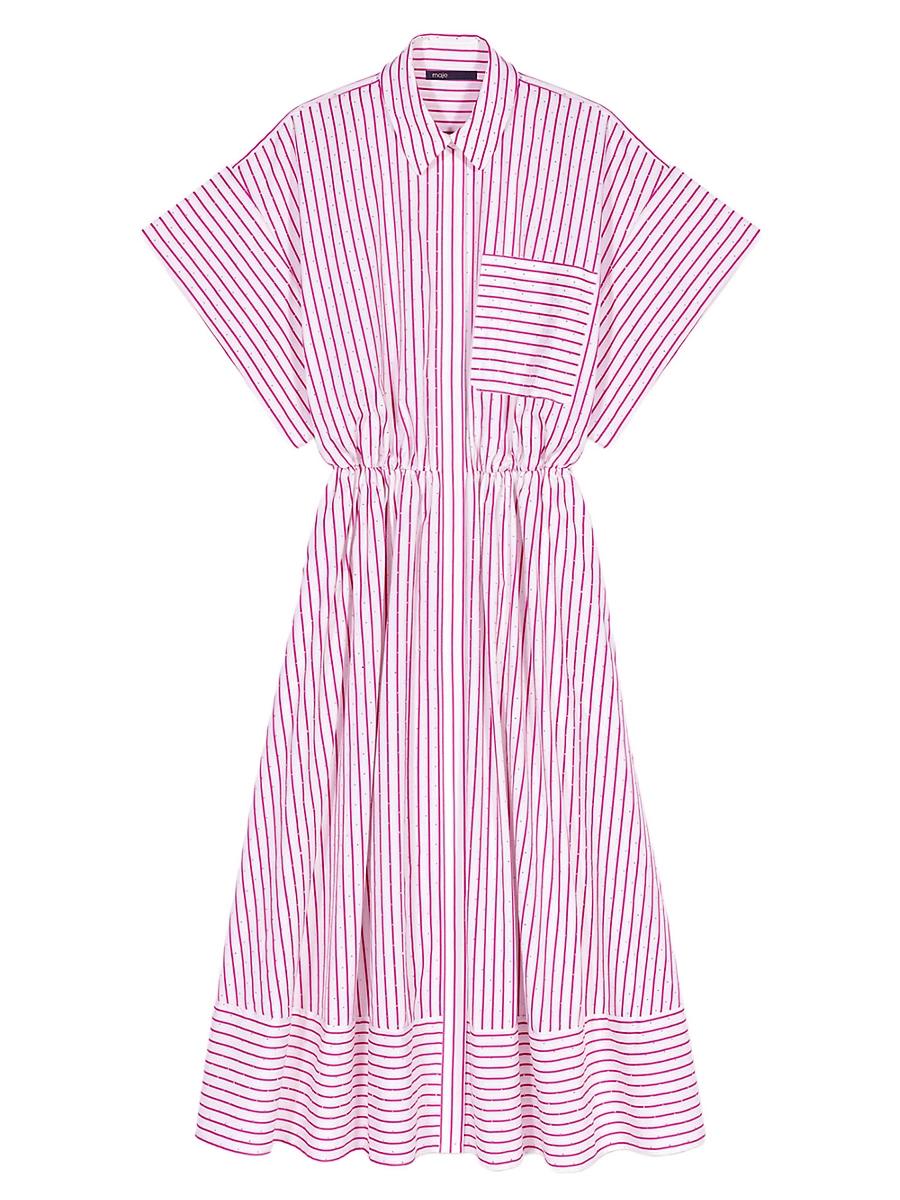 This season, the studio pays tribute to the celebratory spirit and timeless elegance of French fashion. An ode to glamour and sophistication, each piece embodies a party vibe and a sense of celebration, redefining chic with a touch of daring. Adorned with a stripe print and studded with silver rhinestones, this midi dress features a button-down collar, a patch pocket on the chest and short sleeves with drawstrings and stoppers for a gathered effect. Elasticated at the waist, its full skirt features a subtle interplay of horizontal stripes for an irresistibly chic look. Accessorize your seasonal look with ballet flats. Striped printed midi dress Silver rhinestones Shirt collar with covered button placket Elasticated waist Short sleeves with drawstrings and metal stoppers Patch chest pocket Horizontal stripes on the bottom section Main fabric: 49% polyester, 45% cotton, 6% viscose Imported SIZE & FIT Model measurements: 58 Model is wearing a size 36. Lsd Rtw - Maje > Maje > Saks Fifth Avenue > Barneys. Maje. Color: Red Rhinestone. Size: 2.