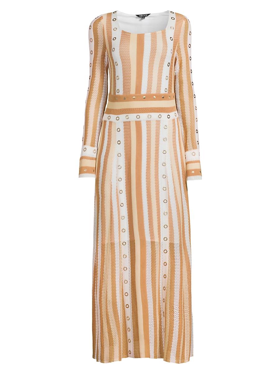 Misooks exquisite maxi dress combines three distinct stitching techniques for a unique texture and appearance and elegant neutral stripes. Accentuated by hand-applied nail head details, this piece features a striking square neckline for a sophisticated finish. Square neck Long sleeves Side zip closure 90% acrylic/10% polyester Lining: 90% polyester/10% spandex Hand wash Imported SIZE & FIT About 52 from shoulder to hem Model measurements: 510 tall Model is wearing a US size Small. Modern Collections - Modern Coll > Misook > Saks Fifth Avenue > Barneys. Misook. Color: Parchment Sand New Ivory. Size: Small.