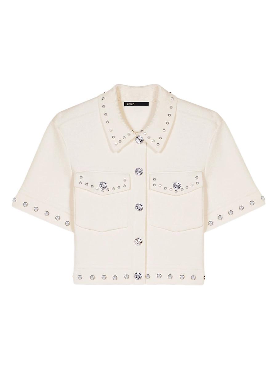 With comfortable materials and pastel colours, our collection celebrates a new kind of romanticism, where the Maje woman asserts herself confidently and effortlessly every day. This stretch knit cardigan is delicately embellished with silver studs. Positioned around the edges, they accentuate the short, structured cut. Alongside a shirt collar and short sleeves, it has a button fastening and two flap pockets. A bold, assertive piece, it can be teamed with belted trousers and a pair of ballet flats. 125MOBOY Short knitted cardigan Silver studs in two sizes Shirt collar Short sleeves Clover button fastening 2 patch pockets with buttoned flaps Designed for a boxy, cropped fit Made with recycled polyester. Made with recycled cotton Main material: 53% cotton, 36% polyester, 11% polyamide Collar: 53% cotton, 36% polyester, 11% polyamide Rib: 53% cotton, 36% polyester, 11% polyamide Model measurements: 59// Model is wearing a size 1 Imported. Lsd Rtw - Maje > Maje > Saks Fifth Avenue > Barneys. Maje. Color: Ecru. Size: XS.