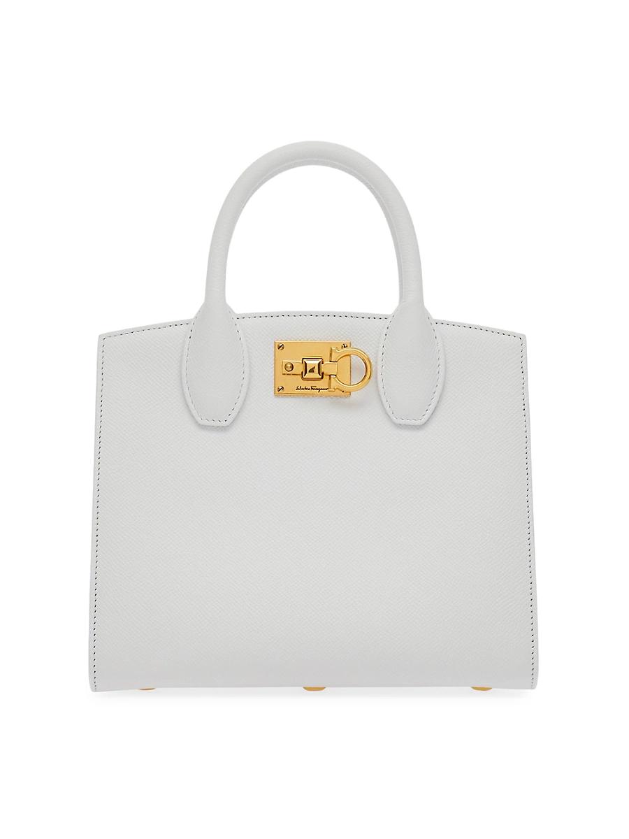 This mini Studio Box bag from FERRAGAMO features Gancini hardware and a removable shoulder strap. Two top handles Removable shoulder strap Interior: one slip pocket Turn-lock closure Leather Made in Italy SIZE About 8.5W x 7.5H x 4.5D ABOUT THE BRAND Italian designer Salvatore Ferragamo began his journey in 1927 in Italy with a vision of creating the worlds most beautiful shoes. Since its inception, Ferragamo has expanded to include clothing, accessories and beauty under the creative direction of Maximilian Davis-who brings a minimalist-meets-maximalist aesthetic to the brand. Handbags - Ferragamo Handbags > Ferragamo > Saks Fifth Avenue > Barneys. FERRAGAMO. Color: White Blue.