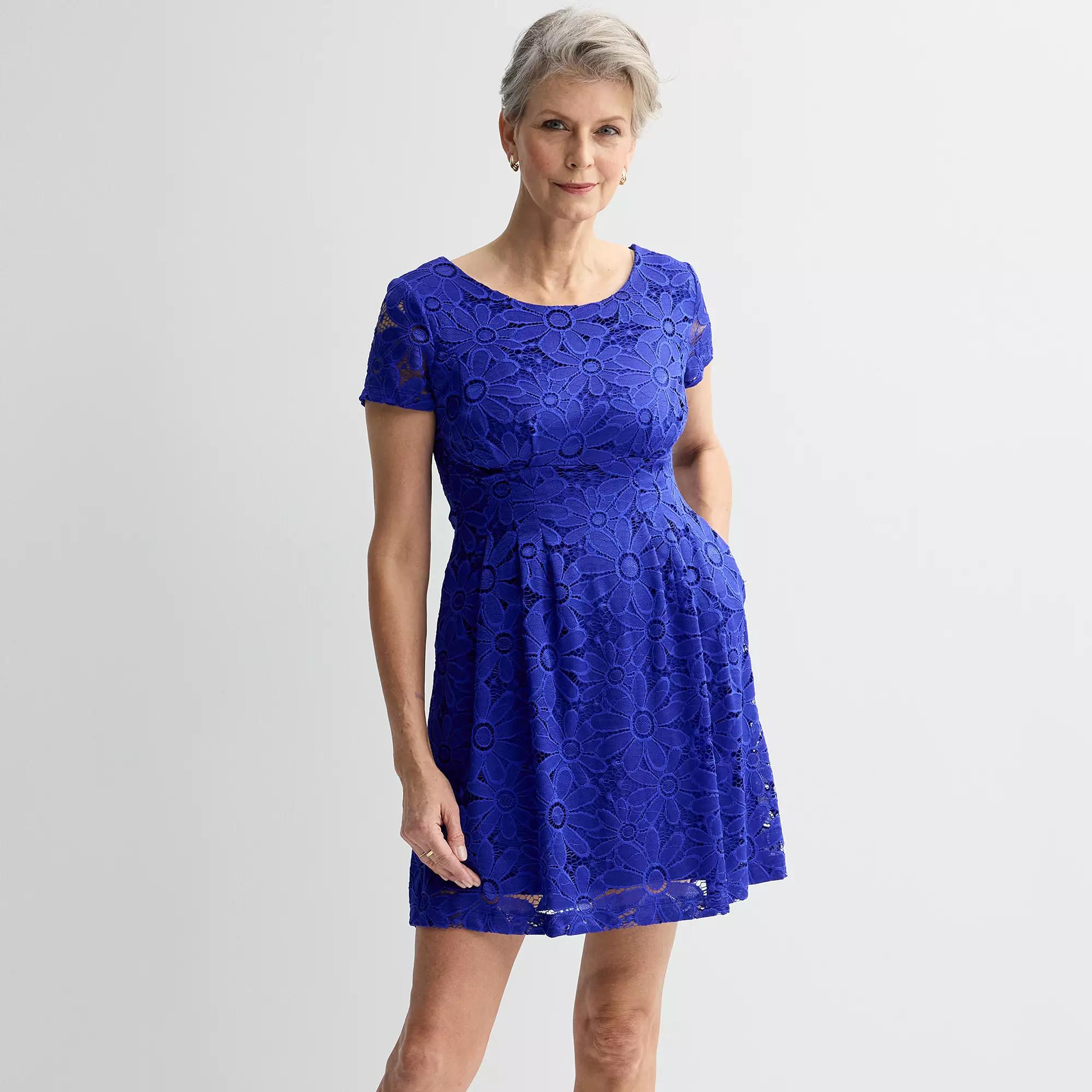 Add a touch of style to your wardrobe with this womens Studio Connection daisy lace dress.Click on this WOMENS GUIDE to find the perfect fit and more!Add a touch of style to your wardrobe with this womens Studio Connection daisy lace dress.Click on this WOMENS GUIDE to find the perfect fit and more!FEATURES Pleated skirt Sheath silhouette 2 pockets Straight hem No closure - pullover styling Set-in sleeves Jewelneck Short sleeves Fully linedFIT & SIZING Regular fit 37-in. length from shoulder to hem Midi length hits below the kneeFABRIC & CARE Polyester, spandex Polyester lining Machine wash delicate and line dry Imported Size: 8. Color: Cobalt. Gender: female. Age Group: adult.