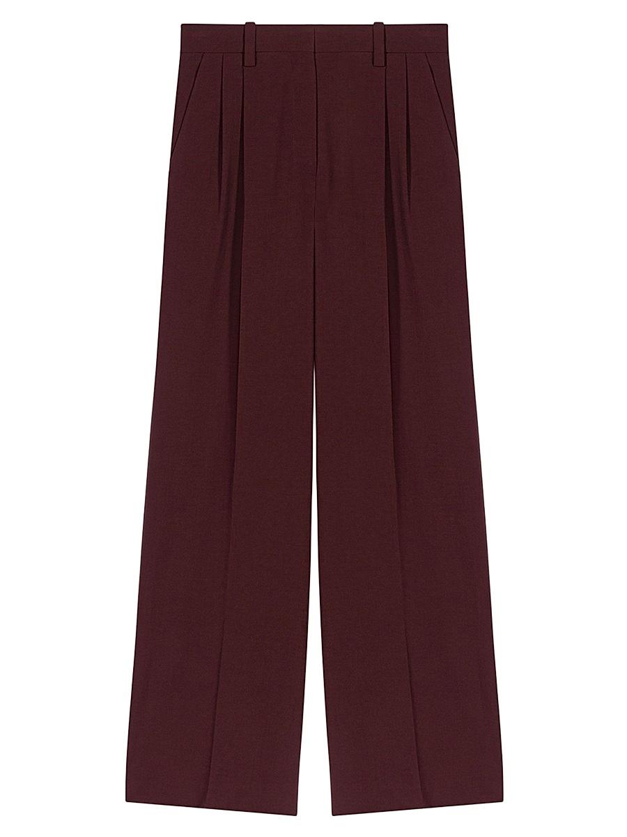 Wide cut and assertive style. Maje reinterprets tailoring in a contemporary version, designed to structure the silhouette precisely. These high-waisted trousers are a wardrobe essential, to be paired with the matching piece and accompanied by signature accessories, such as a leather bag and slingback heels. 225PORDEAU Wide-leg suit trousers High-rise Belt loops Main material: Made from responsibly sourced 53% wool, 42% Recycled polyester, 5% elastane Recycled polyester Made from responsibly sour