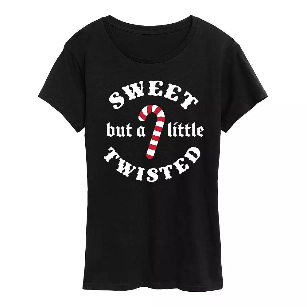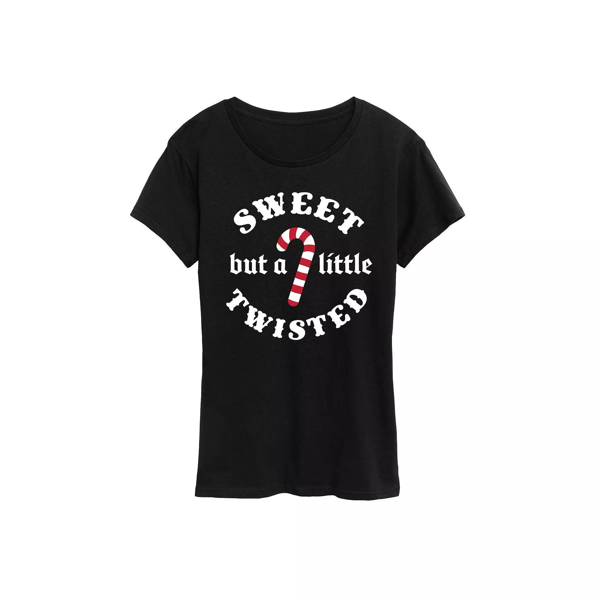 Black Sweet, but a Little Twisted Graphic Tee - Women, Juniors, Plus & Petite Plus. Flaunt your holiday brand of humor with this hip text-enhanced tee boasting a comfy cotton construction and a relaxed fit for long-lasting comfort. Full graphic text: Sweet, but a little twisted.Size S: 26 long from high point of shoulder to hemSize & fit: Relaxed-fit garment with a slightly longer hem. Fits true to size.100% cottonMachine wash; tumble dryImported, screen printed in the USA