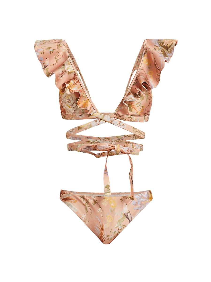 This Tallow bikini from Zimmermann features a luxe floral print and tie detailing. 80% polyamide/20% elastane. Lining: 92% polyamide/8% elastane. Hand wash. Imported. TOP V-neck Wraparound tie closure BOTTOM Elasticized waistband SIZE & FIT Model measurements: 510 tall Model is wearing a US size 4 ABOUT THE BRAND Australian founders and sister-duo Nicky and Simone Zimmermann design with a signature feminine aesthetic, each piece rife with tiers of fabric, rich embroidery and splashy prints. From ruffled bikinis and beachwear to luxe, intricately patterned maxi (and mini) dresses, everything is overtly romantic in the most elevated, effortless way. Outerwear And Swimwear - Contemporary Swim > Zimmermann > Saks Fifth Avenue > Barneys. Zimmermann. Color: Tropical Oasis Pink. Size: 8.