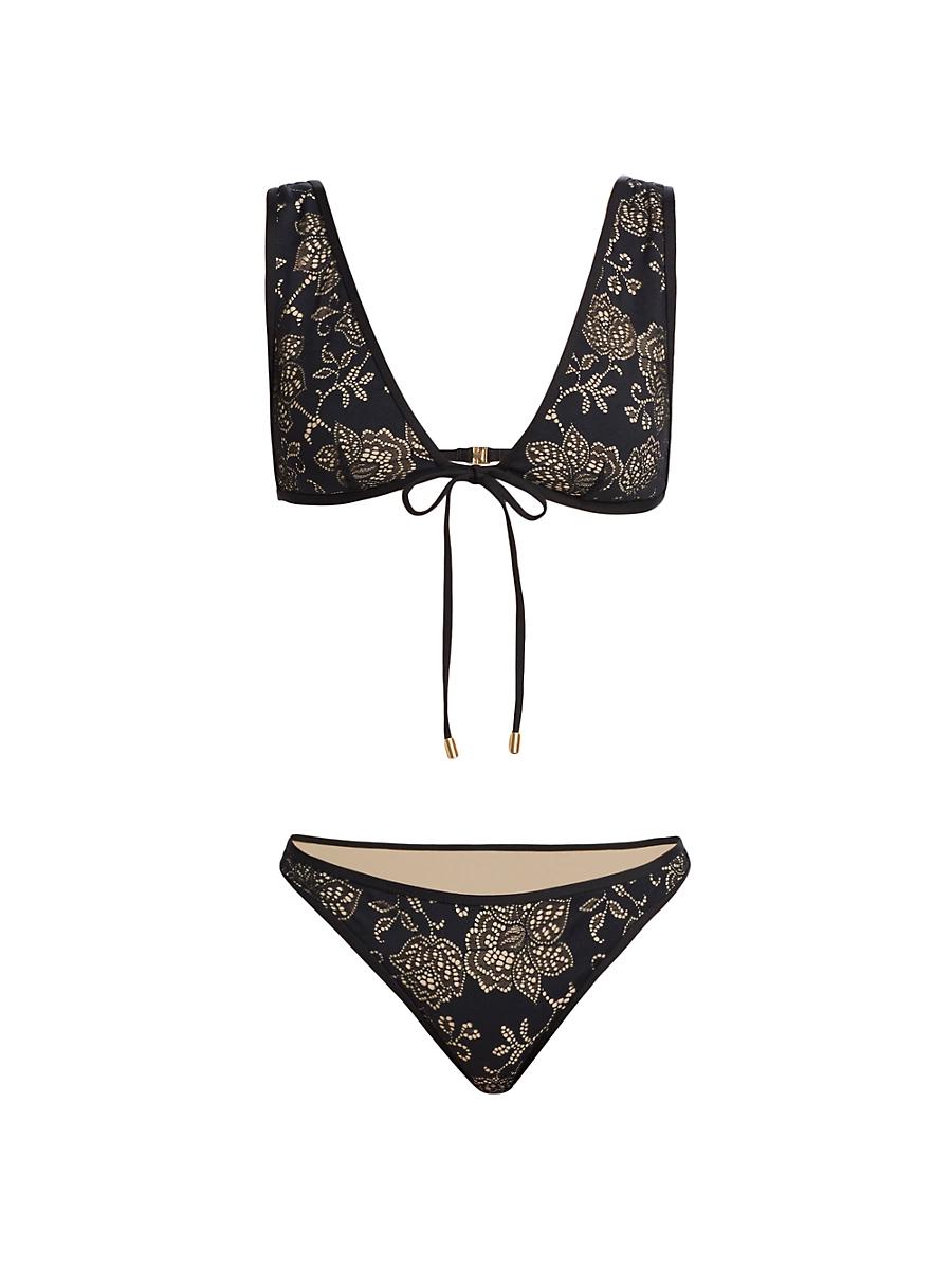 Featuring a lace print, Zimmermanns Tallow bikini is styled with a plunging V-neck top and low-rise bottom. 93.25% nylon/6.75% spandex. Lining: 80% polyamide/20% elastane. Hand wash. Imported. TOP V-neck Adjustable straps Back clasp closure BOTTOM Elasticized waist Pulls on SIZE & FIT Model measurements: 510 tall Model is wearing a US size Small ABOUT THE BRAND Australian founders and sister-duo Nicky and Simone Zimmermann design with a signature feminine aesthetic, each piece rife with tiers of fabric, rich embroidery and splashy prints. From ruffled bikinis and beachwear to luxe, intricately patterned maxi (and mini) dresses, everything is overtly romantic in the most elevated, effortless way. Outerwear And Swimwear - Contemporary Swim > Zimmermann > Saks Fifth Avenue > Barneys. Zimmermann. Color: Black. Size: 4.