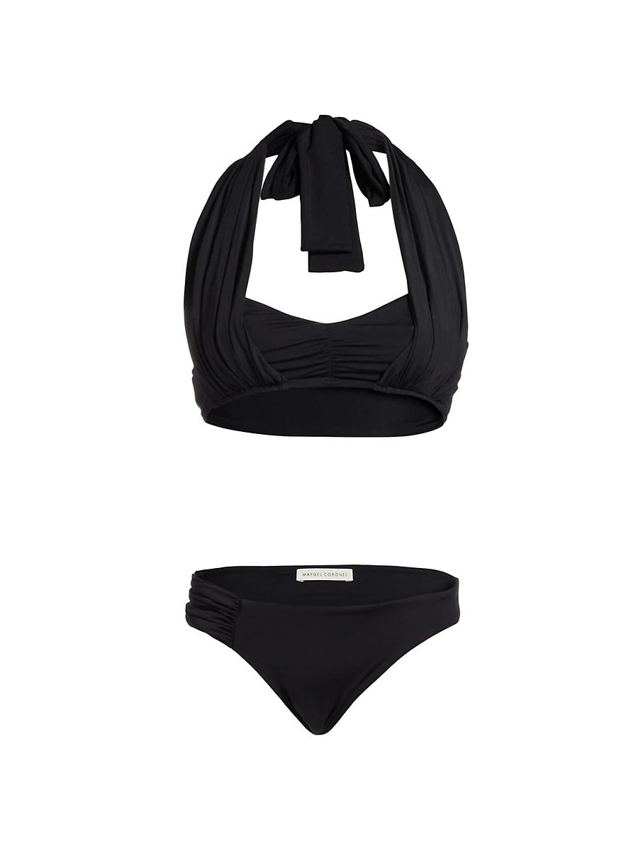 Maygel Coronels Thalassa bikini is designed with gathering for shape and pairs a ruched halter top with a low-rise bottom. 78% polyamide/22% elastane. Hand wash. Imported. TOP Halterneck Halter tie straps Pulls over BOTTOM Ruched side Pulls on SIZE & FIT Model measurements: 510 tall ABOUT THE BRAND Designed for life under the sun, Maygel Coronel delivers chic beachwear from Cartagena, Colombia. The brands bathing suits are made for making a statement, while effortless and versatile dresses transition from seaside to soire with ease, and incorporate signature Latin American design features like volume, ruffles and bold hues. Outerwear And Swimwear - Contemporary Swim > Maygel Coronel > Saks Fifth Avenue > Barneys. Maygel Coronel. Color: Black. Size: 2.
