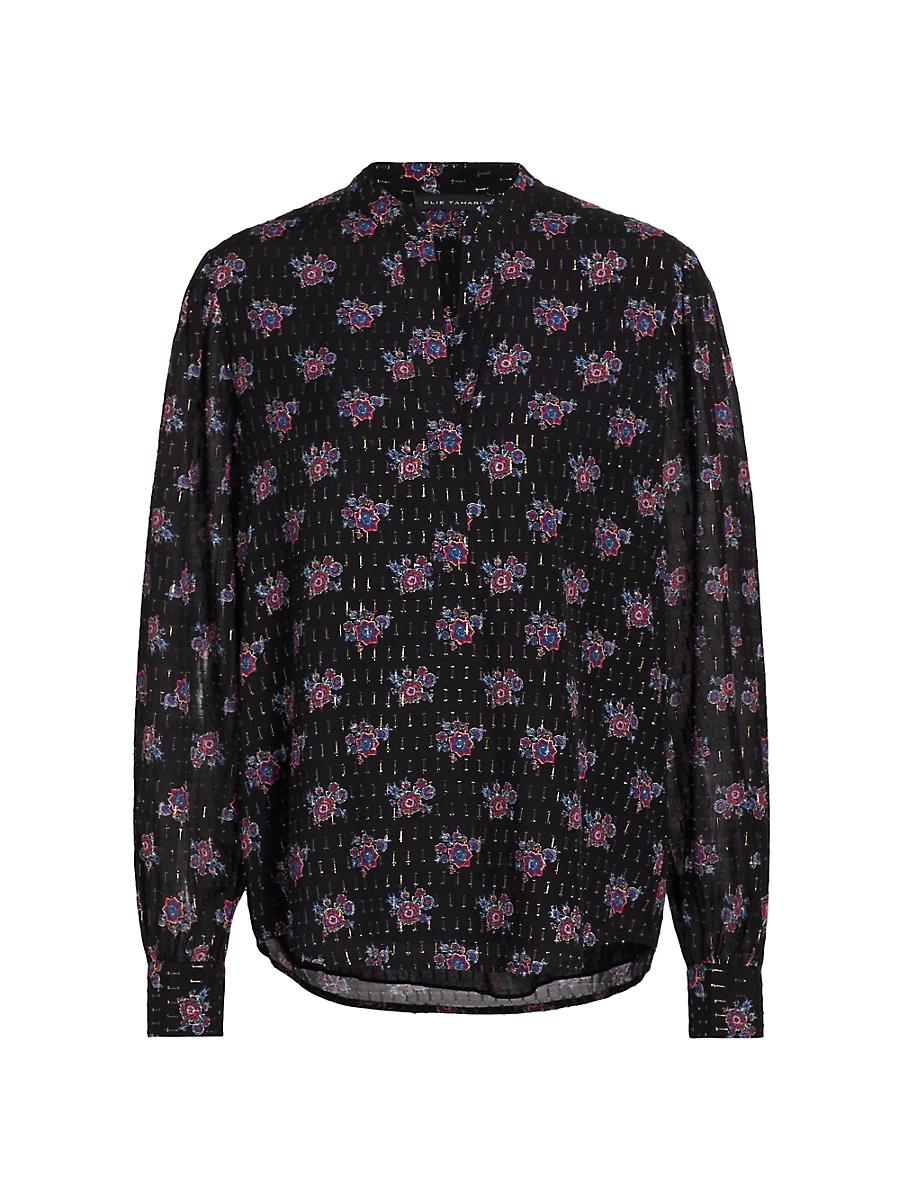 Cut in a relaxed fit, the Akari silk-blend blouse from Elie Tahari flaunts a vibrant floral print and metallic threading. Band collar V-Neck Long sleeves Pulls over Rayon/silk/cotton/metallic Lining: viscose Dry clean Imported SIZE & FIT About 27 from shoulder to hem Model measurements: 510 tall Model is wearing a US size Small. Modern Collections - Elie Tahari > Elie Tahari > Saks Fifth Avenue > Barneys. Elie Tahari. Color: Versailles. Size: XS.