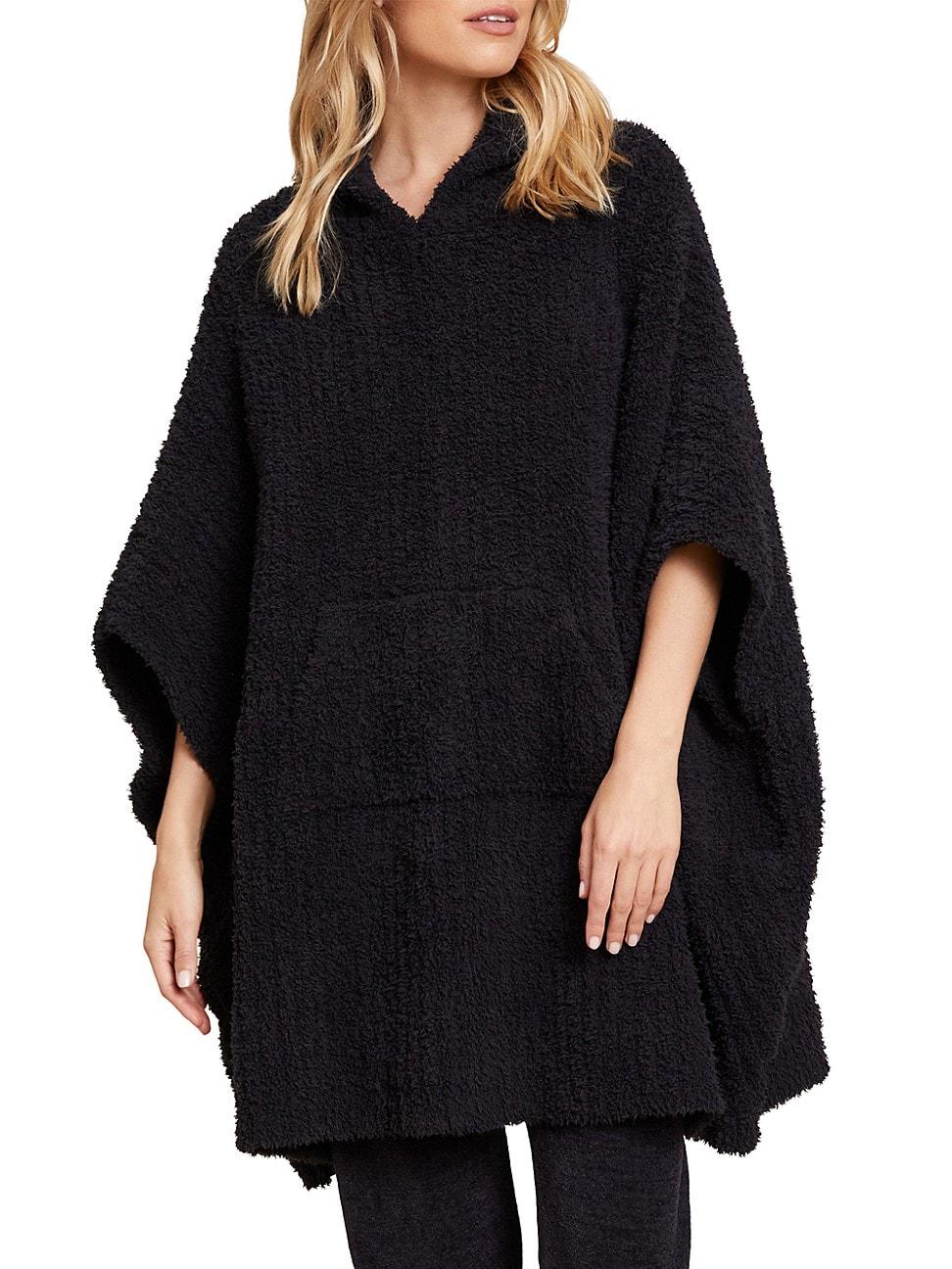 ; Bundle up in the Barefoot Dreams Cozychic Ribbed Cozy poncho that features an oversized silhouette and a soft ribbed fabric. Midweight pullover an attached hood and three-quarter sleeves. Front kangaroo pouch pocket. Straight hemline sits at an extended length. 100% polyester. Machine wash and tumble dry. Imported. Measurements: Length: 37 in Product measurements were taken using size 1 (US 4-8). Please note that measurements may vary by size.