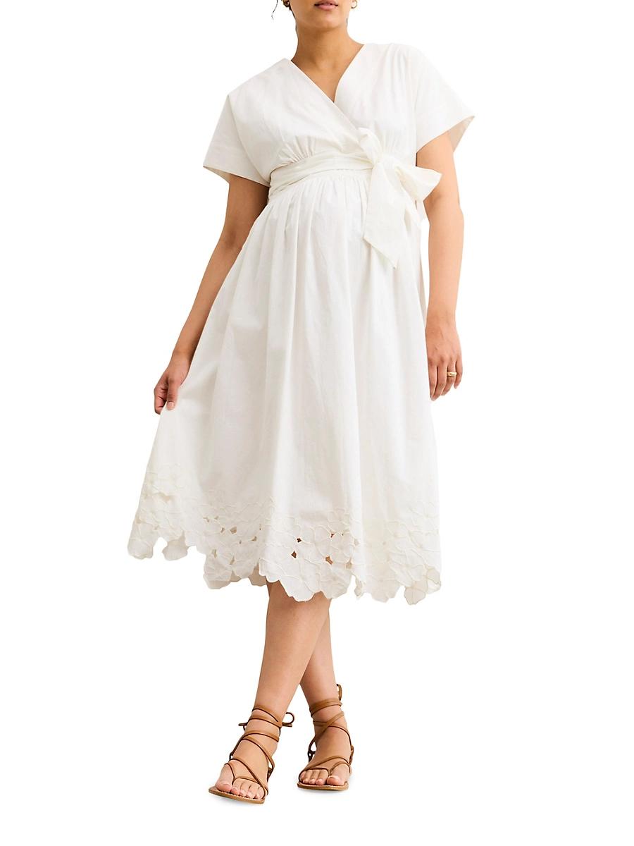 Our true summer stunner. Our best-selling Carolina gets a seasonal refresh in crisp white cotton, embroidered with delicate hollyhock-inspired florals and cutwork detailing along the hem for an airy, elevated finish. Lightly lined in soft cotton voile, with a flattering wrap bodice and adjustable side ties (wear them in front or back, bump to postpartum). Breezy, breathable, and made to grow with you, shes equal parts easy and effortless. 100% Cotton Care: Machine wash cold with like colors Gentle cycle Tumble dry low Cool iron if needed Size 0 / Length: 47 Waist circumference: 37 Imported. Lsd Rtw - Womens Rtw Lsd Mp > Hatch > Saks Fifth Avenue > Barneys. Hatch. Color: White. Size: Small.