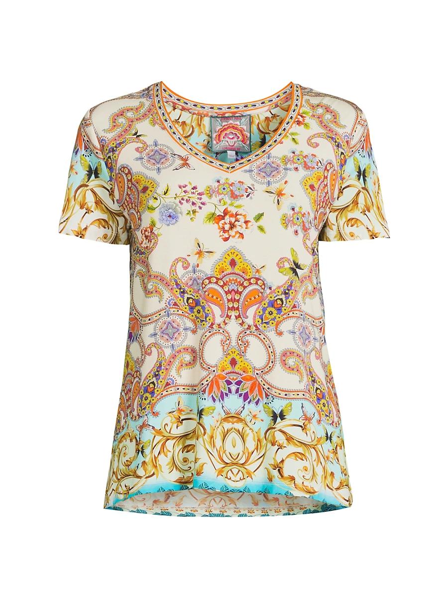 Johnny Was The Janie Favorite V-neck T-shirt spotlights a bold signature print. V-neck Short sleeves Pulls over 95% rayon/5% spandex Machine wash Imported SIZE & FIT About 18 from shoulder to hem Model measurements: 510 tall Model is wearing a US size Small ABOUT THE BRAND Embracing the ease of a West Coast lifestyle, Johnny Was takes a bohemian mindset to a new level in romantic flowing dresses and tops. The brands signatures include floral prints, embroidery, artisan-inspired stitches and embellishments like beading and tassels. Modern Collections - Johnny Was > Johnny Was > Saks Fifth Avenue > Barneys. Johnny Was. Color: Scroll Scarf. Size: XL.