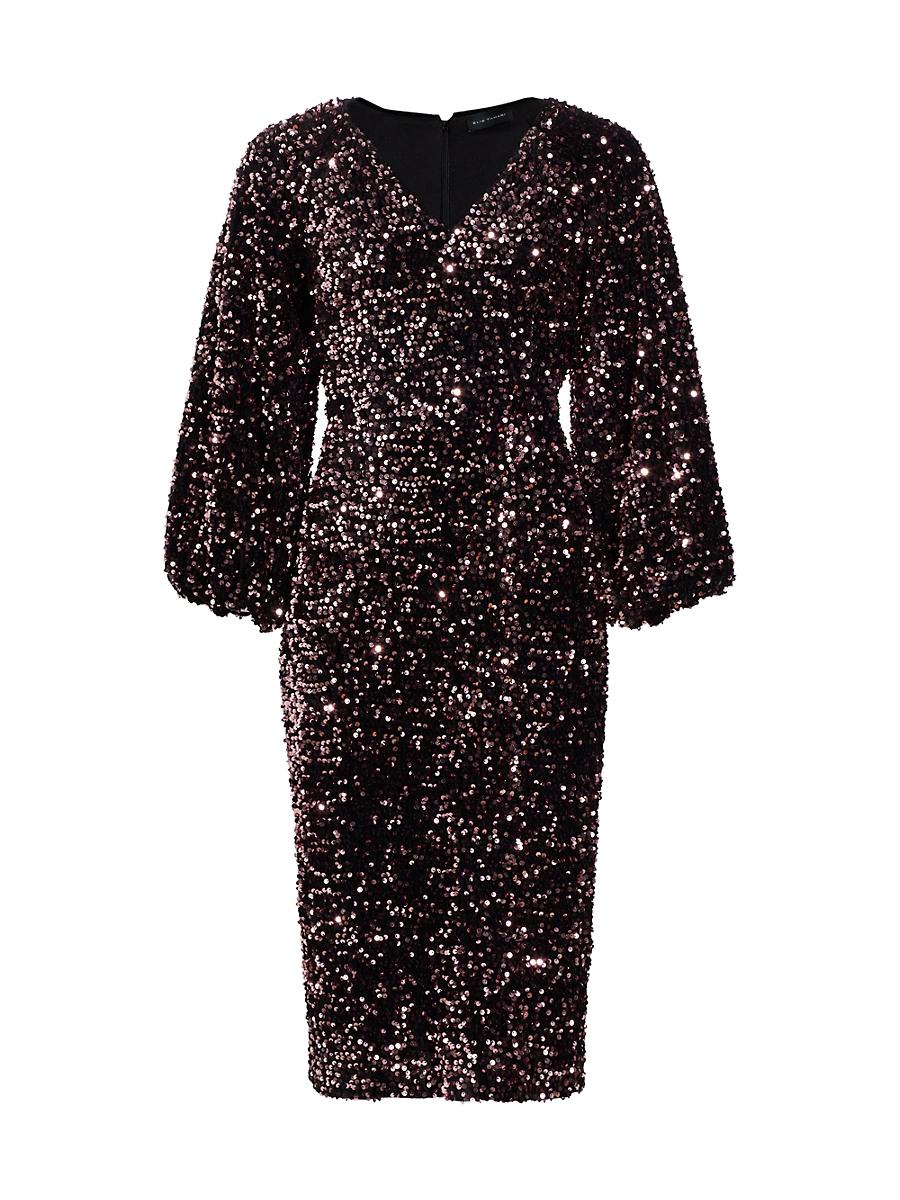ONLY AT SAKS. Shimmering sequins cover Elie Taharis The Robin midi-dress. This sheath silhouette features a V-neck, bracelet-length blouson sleeves, and a concealed back-zip closure. V-neck Bracelet-length blouson sleeves Concealed back zip closure 100% polyester Lining: 100% polyester Machine wash Imported SIZE & FIT About 45 from shoulder to hem Model measurements: 510 tall Model is wearing a US size 4. Modern Collections - Elie Tahari > Elie Tahari > Saks Fifth Avenue > Barneys. Elie Tahari. Color: Rouge Pink. Size: 16.
