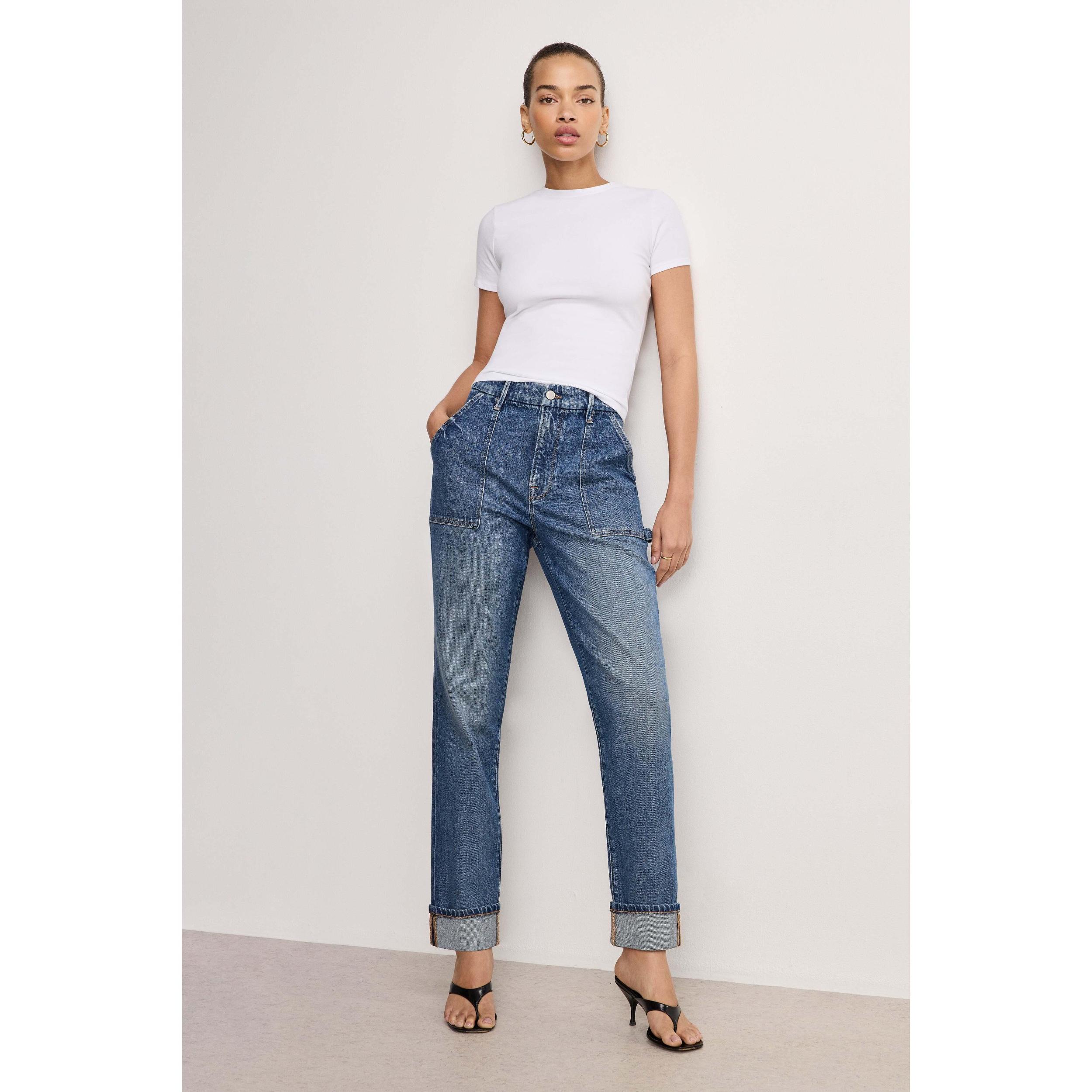 Americas Favorite Skinny Jean! Meet your new weekend fling, the Weekender Jeans have the high-rise fit our squad loves, with a looser leg and drop crotch fit to make your weekends ultra-comfortable. Finished with a rolled hem, these jeans are perfect for both relaxing and getting things done. High-rise Relaxed legs Classic 5-pockets Front zipper closure Gap-proof waistband Reinforced belt loops Tummy smoothing technology Cropped length Rolled hem Medium wash Inseam: 28 Fabric: 69% Cotton, 30% Tencel, 1% Elastane Care: Machine wash cold, inside out. Dry flat or hang dry. For more info, please see our denim care guide. | Womens The Weekender Carpenter Jeans (Indigo, Size 22 Plus