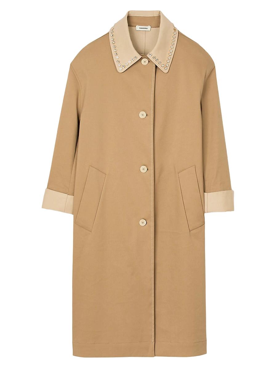 Long trench coat in double-faced gabardine with rhinestone shirt collar, long sleeves, button placket and side pockets. Sandro Womens double-faced gabardine long trench coat Rhinestone shirt collar Long sleeves Welt pockets Vent at the back Main material: 69% cotton, 29% polyamide, 2% elastane Imported SIZE & FIT Model measurements: 59 Model is wearing a size 4. Lsd Rtw - Sandro > Sandro > Saks Fifth Avenue > Barneys. Sandro. Color: Camel. Size: 4.