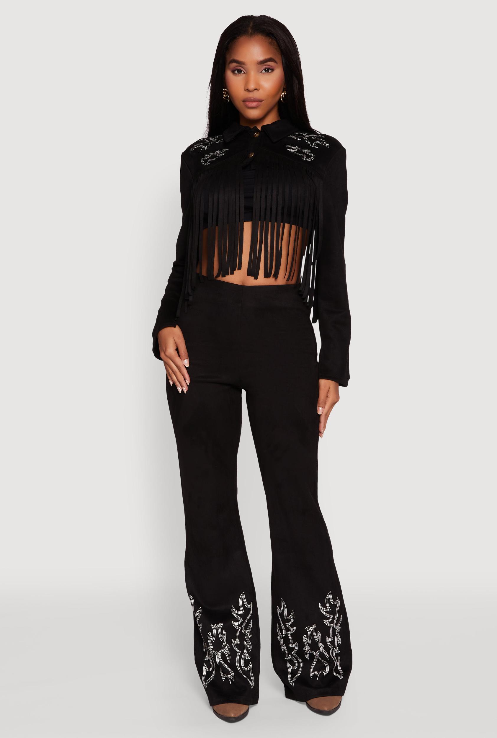 Step up your style game with these Trendy High Waisted Faux Suede Flare Leg Pants. Perfect for festival vibes or casual days out, these pants blend comfort and cool effortlessly. The high waist flatters your figure while the relaxed fit and flare leg create a flattering silhouette that moves with you. Crafted from soft faux suede and featuring subtle embroidered details, they add just the right touch of texture and edge. Zip them up and get ready to turn heads wherever you go. High-waisted design for a flattering, elongating fit Soft faux suede material for a luxe look without the splurge Relaxed fit with flare legs for ultimate comfort and style Full-length pants perfect for festival season or everyday wear Embroidered embellishments add a unique, trendy detail Easy zipper closure at the back for a sleek finish Model Pictured Wearing Size SHeight 58, Bust 32, Waist 25, Hips 36Fits True To SizeMeasurementsInseam: 34 inContent and Care Material: 90% Polyester, 10% Spandex Care Instructions: Hand Wash Country Of Origin: China Rainbow Item Number 3413058752042
