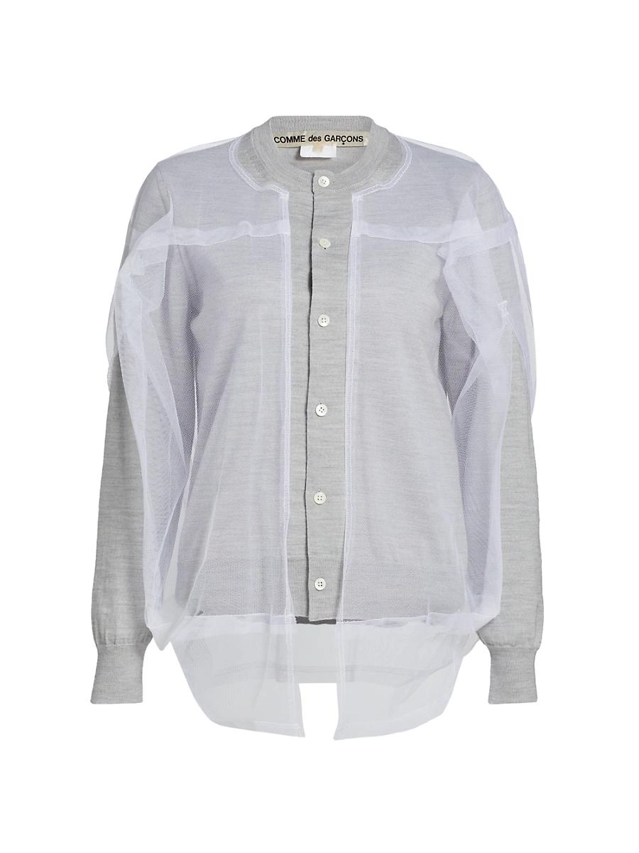 Crafted of lightweight wool, this knit button-front cardigan from Comme des Garons flaunts a tulle overlay. Crewneck Long sleeves Button-front closure 100% wool Combo: 100% nylon Dry clean Made in Japan SIZE & FIT About 24 from shoulder to hem Model measurements: 510 tall Model is wearing a US size Small. Advanced Designer - Designer Collections > Comme Des Garons > Saks Fifth Avenue > Barneys. Comme des Garons. Color: Grey White. Size: Large.
