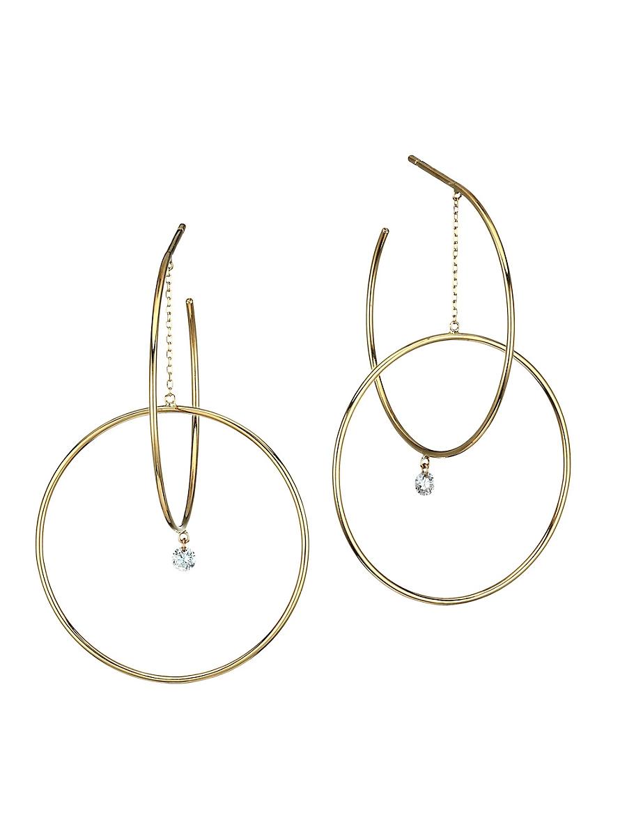 From the Turn Around Collection. The airy and clean lines of slim gold hoops are showcased in this modern design featuring two interlocking hoops, one trailing a diamond drop. Round-cut diamonds, 0.18 tcw Diamond clarity; SI1 Diamond color; H 18K yellow gold, 3.78 grams Post back Imported. Fashion Jewelry - Fashion Designer > Perse > Saks Fifth Avenue > Barneys. Perse. Color: Gold.