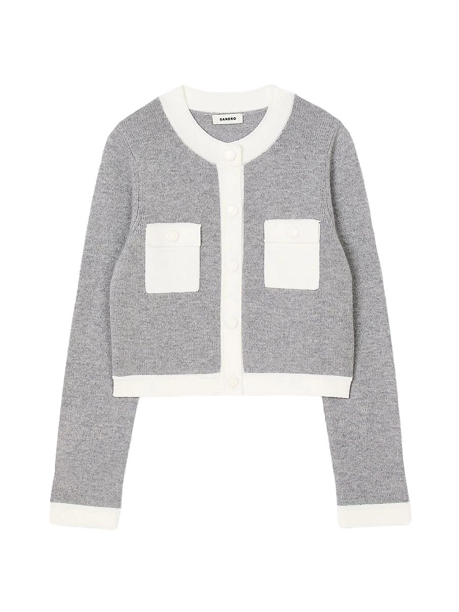 Two-tone cashmere and wool knit cardigan with round neck, long sleeves, button placket, and patch pockets. E25MACARON Sandro Womens two-tone cardigan Wool and cashmere knit fabric Round neck Long sleeves Patch pockets with flaps and press studs Contrast trim Main fabric: 90% wool, 10% cashmere Tab: 53% viscose, 45% polyamide, 2% elastane Pocket: 53% viscose, 45% polyamide, 2% elastane Wrist: 53% viscose, 45% polyamide, 2% elastane Bottom: 53% viscose, 45% polyamide, 2% elastane Collar: 53% viscose, 45% polyamide, 2% elastane Imported SIZE & FIT Model measurements: 59 Model is wearing a size 1. Lsd Rtw - Sandro > Sandro > Saks Fifth Avenue > Barneys. Sandro. Color: Grey. Size: Large.