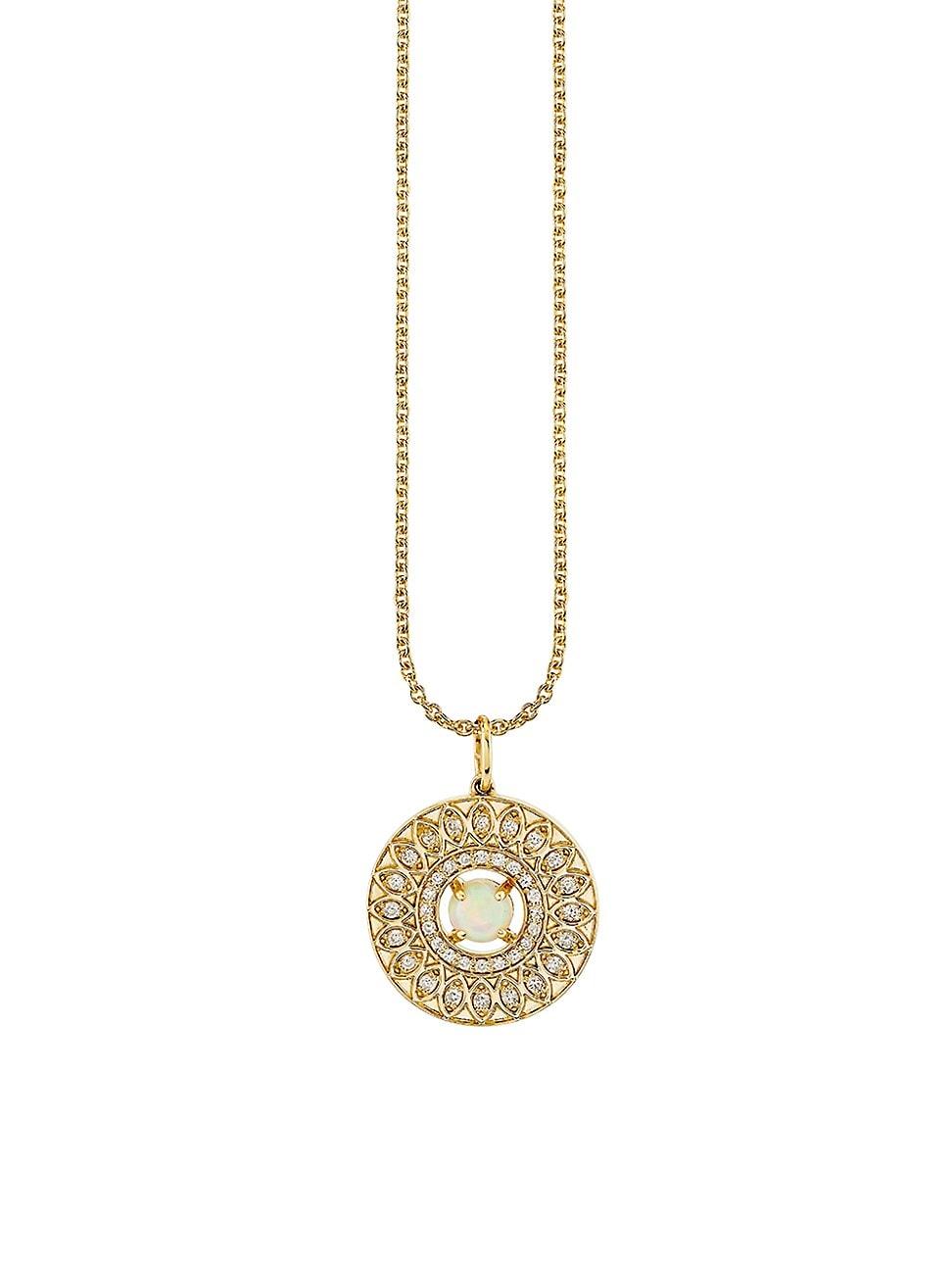 From the Under the Sea Collection. Sydney Evans exquisite necklace is crafted of 14K yellow gold. This style showcases a wheel pendant with an Opal center framed with round diamonds on a Tiffany chain. Opal Diamond, 0.16 tcw Diamond color: H/i Diamond clarity: Si2 14K yellow gold Lobster clasp Imported SIZE Adjustable chain, about 16-18 L. Fashion Jewelry - Fashion Designer > Sydney Evan > Saks Fifth Avenue > Barneys. Sydney Evan. Color: Yellow Gold.
