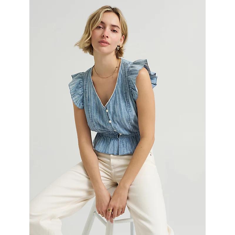 A flirtier kind of V-neck, this blouse comes with fluttered sleeves and a light peplum, all trimmed in a white lace along the neckline. Adorned with a subtle white stripe that matches the buttons down the front, it brings a romantic feel to your everyday look. 100% Cotton. Indigo Stripe Dobby. L.