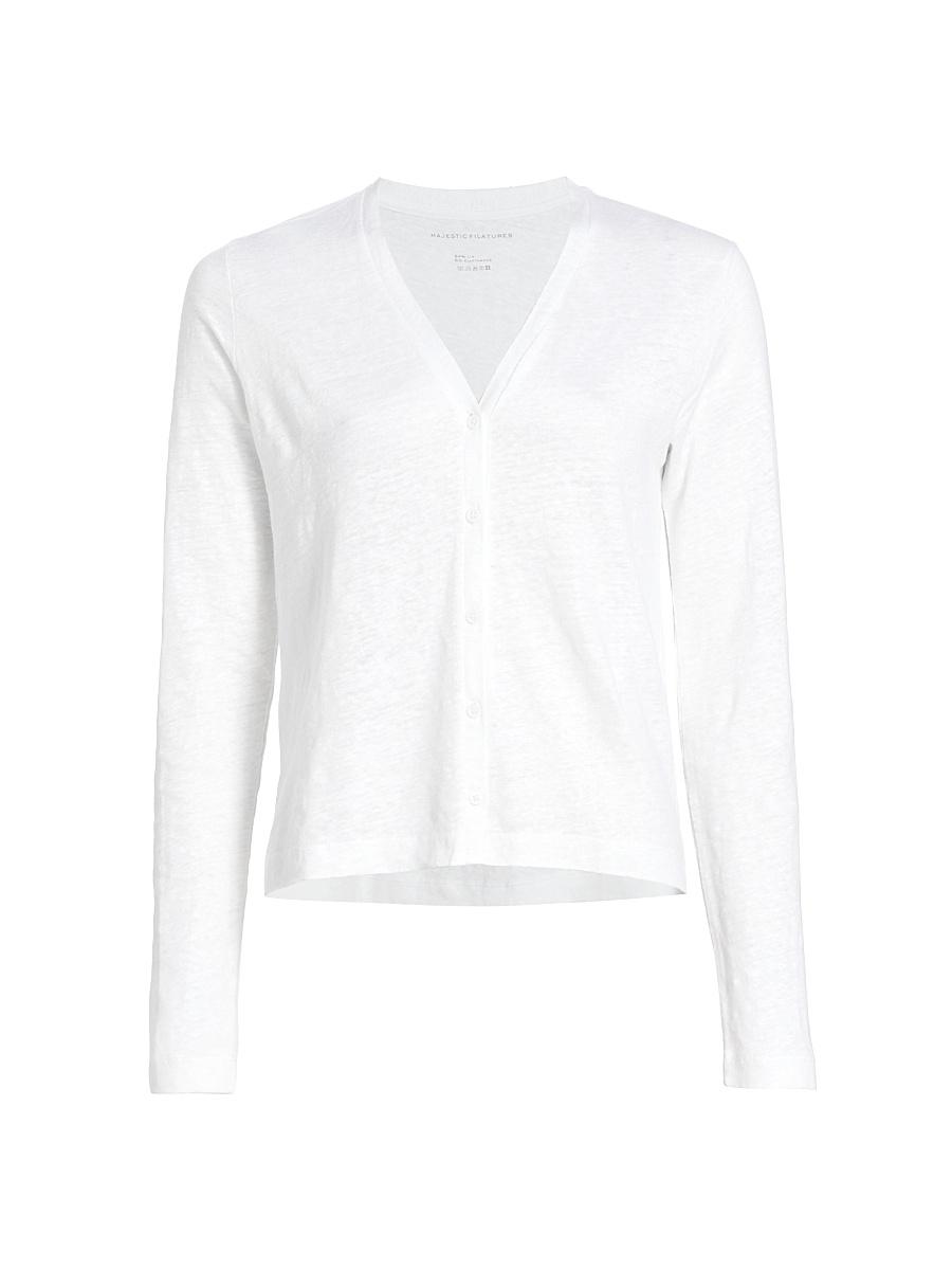 Crafted of a stretch linen-blend fabrication, this versatile v-neck cardigan features button closure and a fitted cut. V-neck Long sleeves Button-front closure Linen/elastane Machine wash Made in Portugal of Portuguese fabric SIZE & FIT Fitted About 25 from shoulder to hem Model measurements: 511 tall, 32 bust, 24 waist, 34 hips Model is wearing a US size 4. Modern Collections - Majestic > Majestic Filatures > Saks Fifth Avenue > Barneys. Majestic Filatures. Color: Pirate. Size: Small.