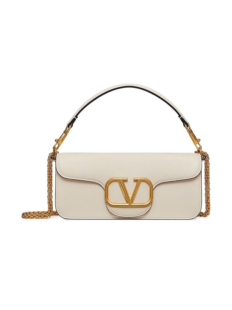 Valentino Garavani Loc shoulder bag in calfskin with metallic VLogo Signature detail. The bag can be carried on the shoulder/crossbody or as a handbag thanks to the removable handle and adjustable, removable chain. Antique-brass finish metallic parts Magnetic fastening Detachable leather handle Shoulder strap with detachable sliding chain Lining in Nappa Interior: flat open pocket Drop Length: min 26 cm / 10.2 in. max 50 cm / 19.7 in. Sizes: W 27 x H 13 x D 6 cm / W 10.6 x H 5.1 x D 2.4 in. Made in Italy. Lsd Handbags - Valentino Handbags > Valentino Garavani > Saks Fifth Avenue > Barneys. Valentino Garavani. Color: Light Ivory.