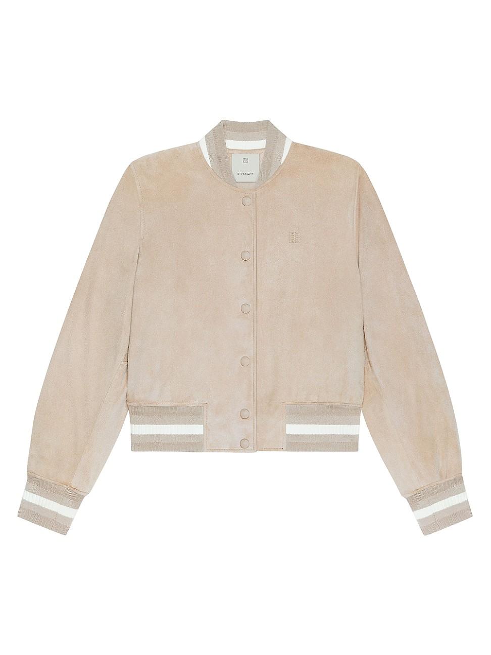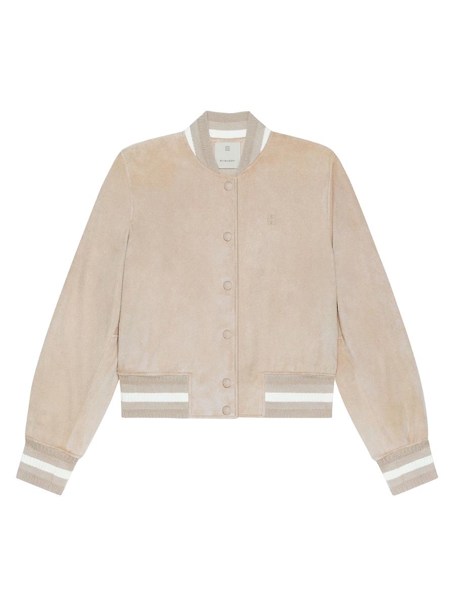 Varsity jacket in suede. Varsity jacket in suede leather Small 4G emblem debossed on the chest Ribbed elasticated knit collar, cuffs and hem with contrasting stripes Tone-on-tone snap closure Classic fit Composition: 100% goat leather Imported. Lsd Rtw - Givenchy Rtw > Givenchy > Saks Fifth Avenue > Barneys. Givenchy. Color: Sand. Size: 4.
