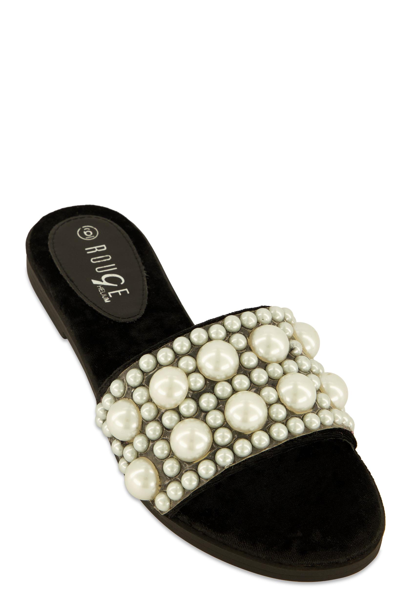 Womens Velvet Faux Pearl Band Slide Sandals