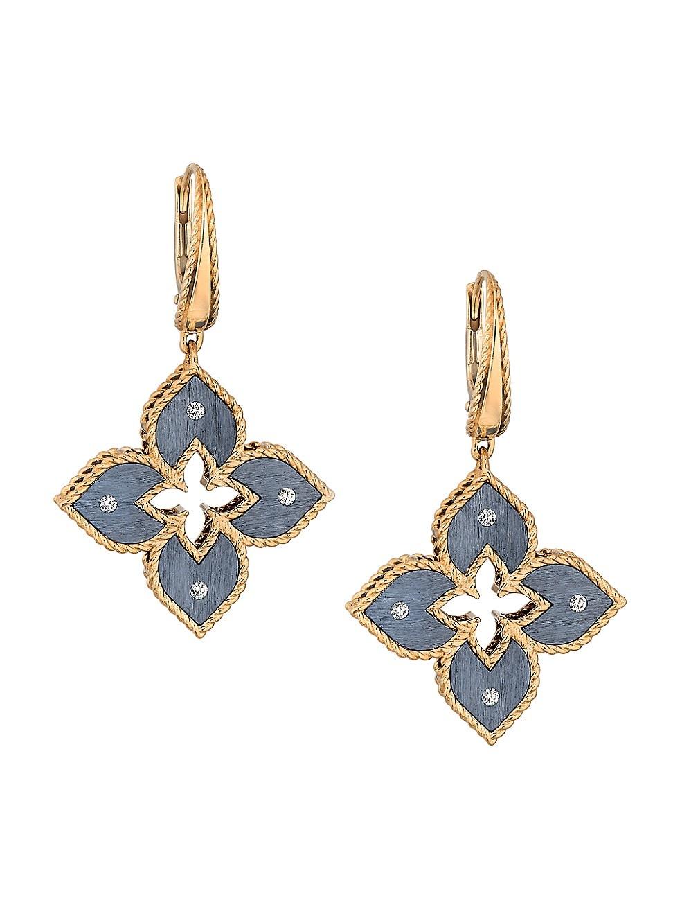 From the Venetian Princess Collection. Crafted of 18K rose gold, Roberto Coins earrings feature charming flower drops accented with blue titanium and shimmering flush-set diamonds. The acclaimed designer signs each pair with a single ruby placed in a concealed location. Diamonds, 0.09 tcw Diamond color grade: G-H Diamond clarity grade: SI1 18K rose gold/blue titanium Leverback Made in Italy SIZE About 0.98L ABOUT THE BRAND Jewelry designer Roberto Coin founded his eponymous line in 1996, with a strong emphasis on elegance and creative experimentation. Each piece is the result of a long creative process, taking inspiration from cultural influences and nature. Fine Jewelry - Roberto Coin Asset > Roberto Coin > Saks Fifth Avenue > Barneys. Roberto Coin. Color: Rose Gold.