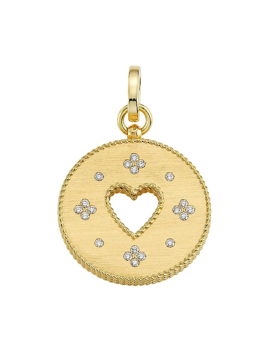 ONLY AT SAKS. From the Venetian Princess Collection. Featuring an open heart motif, Roberto Coins medallion pendant is crafted of 18K yellow gold accented with textured details and glittering round flush-set diamonds. The acclaimed jewelry designer signs each piece with a single ruby placed in a concealed location. Diamonds, 0.27 tcw Diamond color grade: G-H Diamond clarity grade: SI1 18K yellow gold Hinged clip bail Made in Italy SIZE Drop, about 1 Please note: Pendant only. Chain sold separately. ABOUT THE BRAND Jewelry designer Roberto Coin founded his eponymous line in 1996, with a strong emphasis on elegance and creative experimentation. Each piece is the result of a long creative process, taking inspiration from cultural influences and nature. Fine Jewelry - Roberto Coin Asset > Roberto Coin > Saks Fifth Avenue > Barneys. Roberto Coin. Color: Yellow Gold.