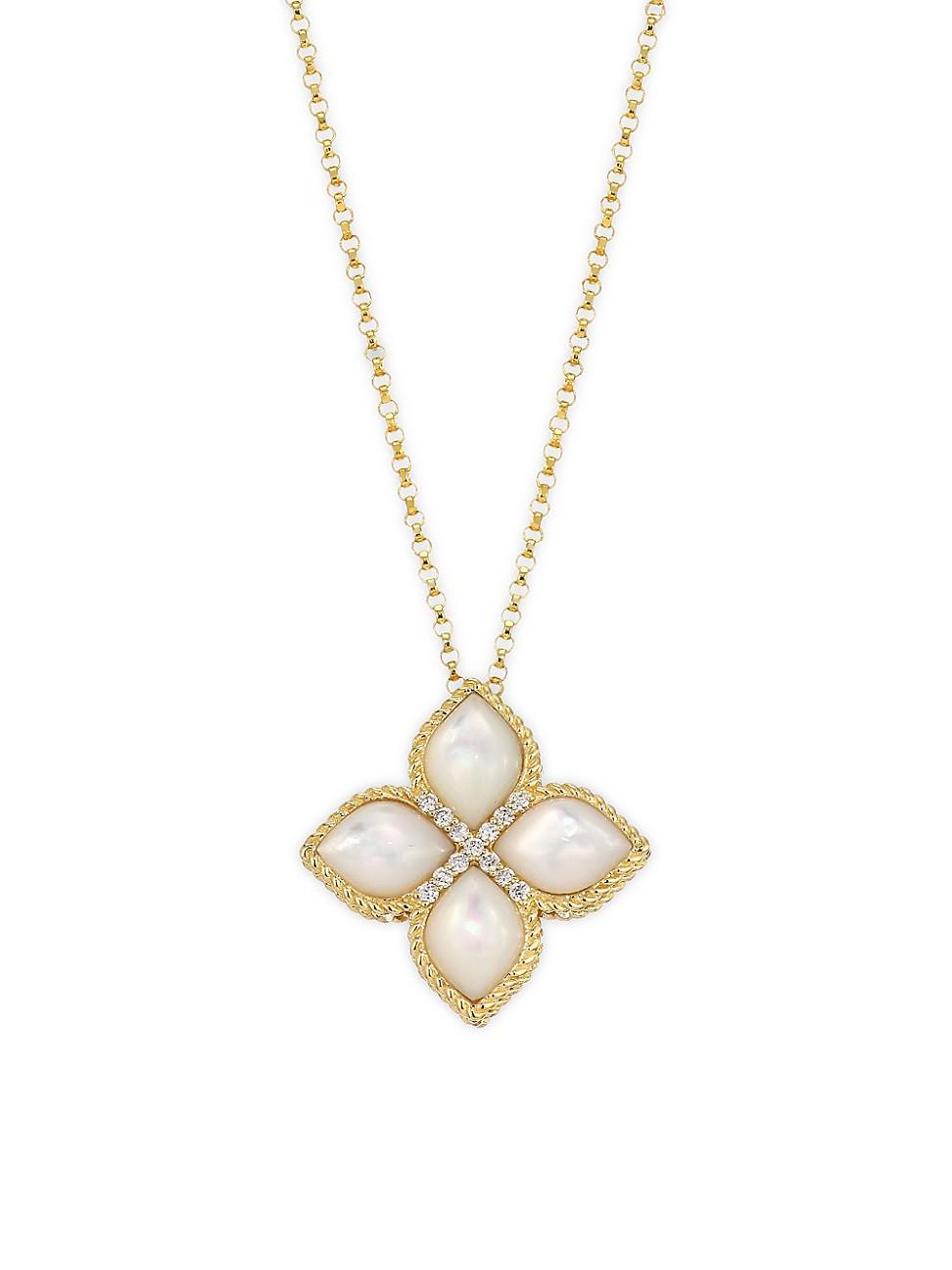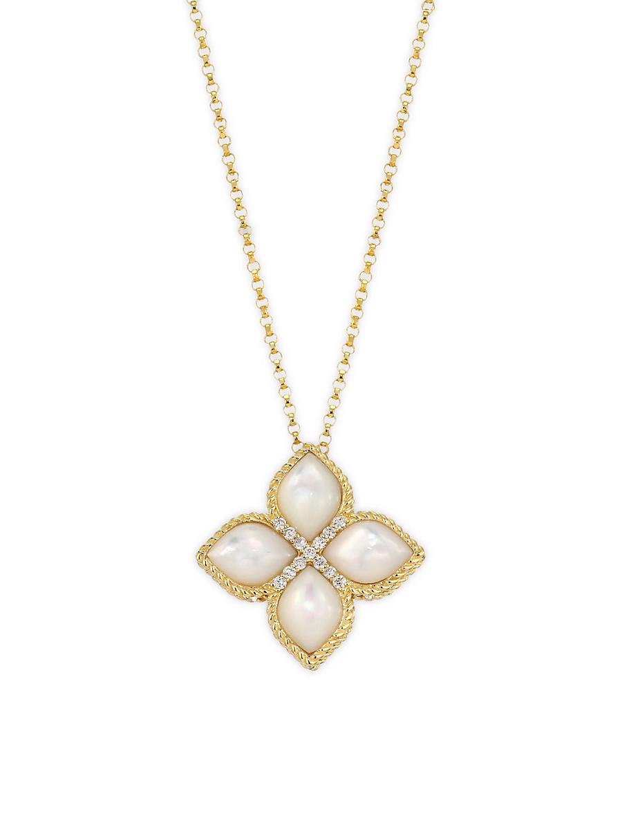 From the Venetian Princess Collection. Deluxe mother-of-pearl and diamond embellishments elevate flower pendant set on a link chain. Roberto Coin signs each piece with a single ruby placed in a hidden position. Mother-of-pearl Diamonds, 0.06 tcw 18K yellow gold Lobster clasp Made in Italy SIZE Length, 16-18 Pendant width, 0.78 ABOUT THE BRAND Jewelry designer Roberto Coin founded his eponymous line in 1996, with a strong emphasis on elegance and creative experimentation. Each piece is the result of a long creative process, taking inspiration from cultural influences and nature. Fine Jewelry - Roberto Coin Asset > Roberto Coin > Saks Fifth Avenue > Barneys. Roberto Coin. Color: Yellow Gold.
